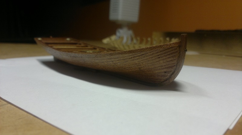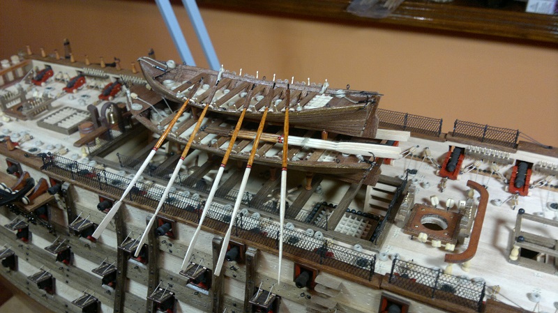 Szalupkę wykańczałem według własnego pomysłu. Te listeweczki dały w kość. Na sam koniec postanowiłem stworzyć wiosła. Po 3 pary wystarczy. Na zdjęciach przymiarka Łajby