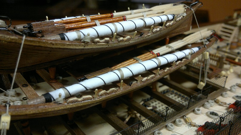 Analogicznie wykonałem mniejszą szalupę Z nudów zrobiłem maszty z nawiniętymi żaglami. (Żagle brudziłem w późniejszym czasie) Całość zamontowanie na okręcie przy pomocy drewnianych tralek 20mm, które troszkę skróciłem. Całość wzmocniona podporami by szalupy stabilnie siedziały.