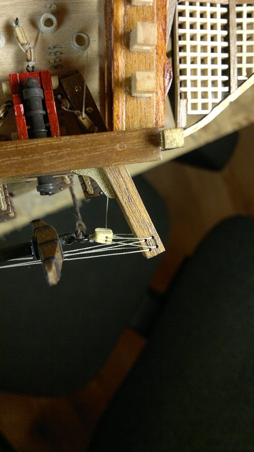 Hmmm... teraz jak to nazwać.. waloryzacja chyba bo inne słowo nie przychodzi na myśl. Jakieś zabezpieczenia by załoga nie powpadała Zastosowałem szpilki z oczkami potraktowane oksydą. Siateczka docięta na wymiar potem do kupy wszystko razem. Dodałem też zwinięte z linek pojemniczki na kule armatnie.