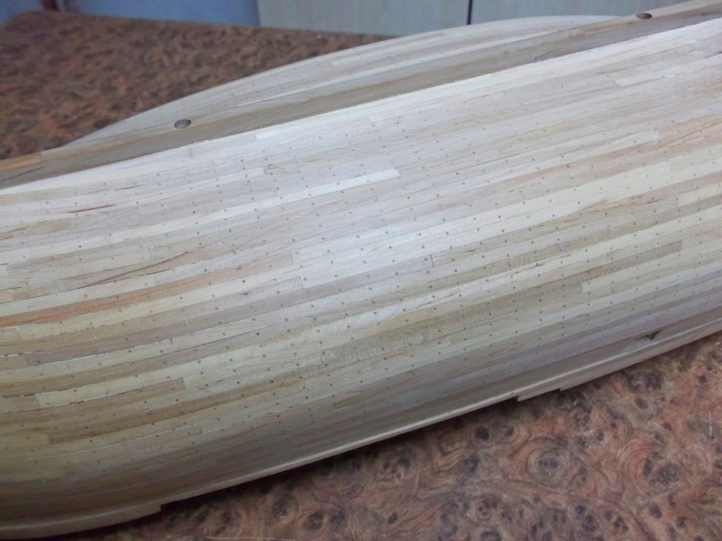 Reszta pokładu z cieńszych klepek. Powiercone otwory 0,8mm i wklejone brzozowe wykałaczki: