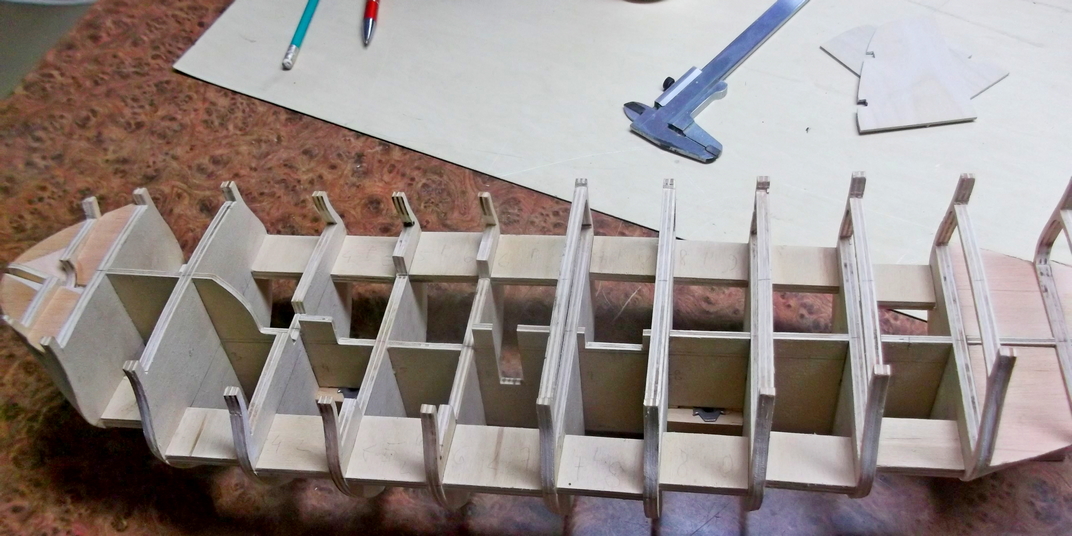 Wszystkie wręgi ze sklejki 6mm, podłużnica ma 4mm grubości. Całość wymaga jeszcze dokładnego dopasowania wszystkich krzywizn i skosów:
