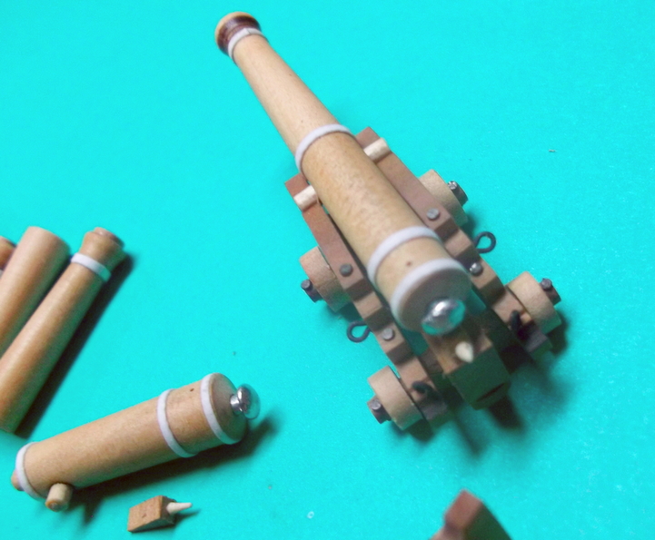Lufy armat toczone tym samym sposobem, ale z jabłoni. Dla ułatwienia toczenia, wykonałem je jako dwudzielne. Te maleńkie uchwyty klinów też wykonałem za pomocą toczenia- szlifowania: