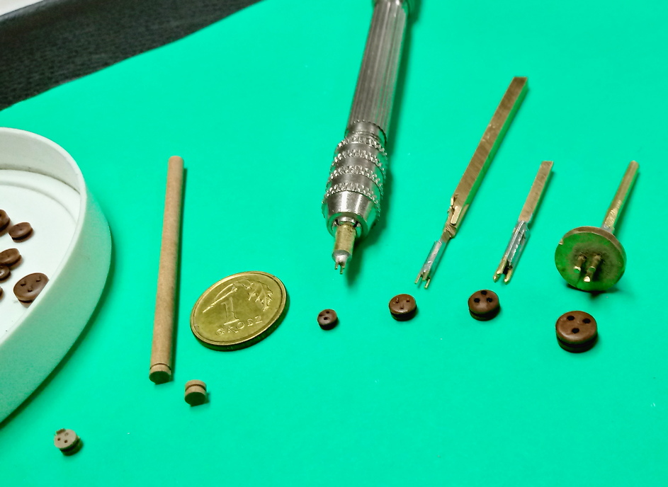 Na zdjęciu widać poszczególne etapy wykonania. Należało wykonać aż cztery rozmiary (średnice 6mm, 5mm, 4mm i 3mm). Do obróbki każdego rozmiaru wykonałem przyrządy.Użyłem drewna gruszy, bez bejcy, jedynie gorący pokost lniany.