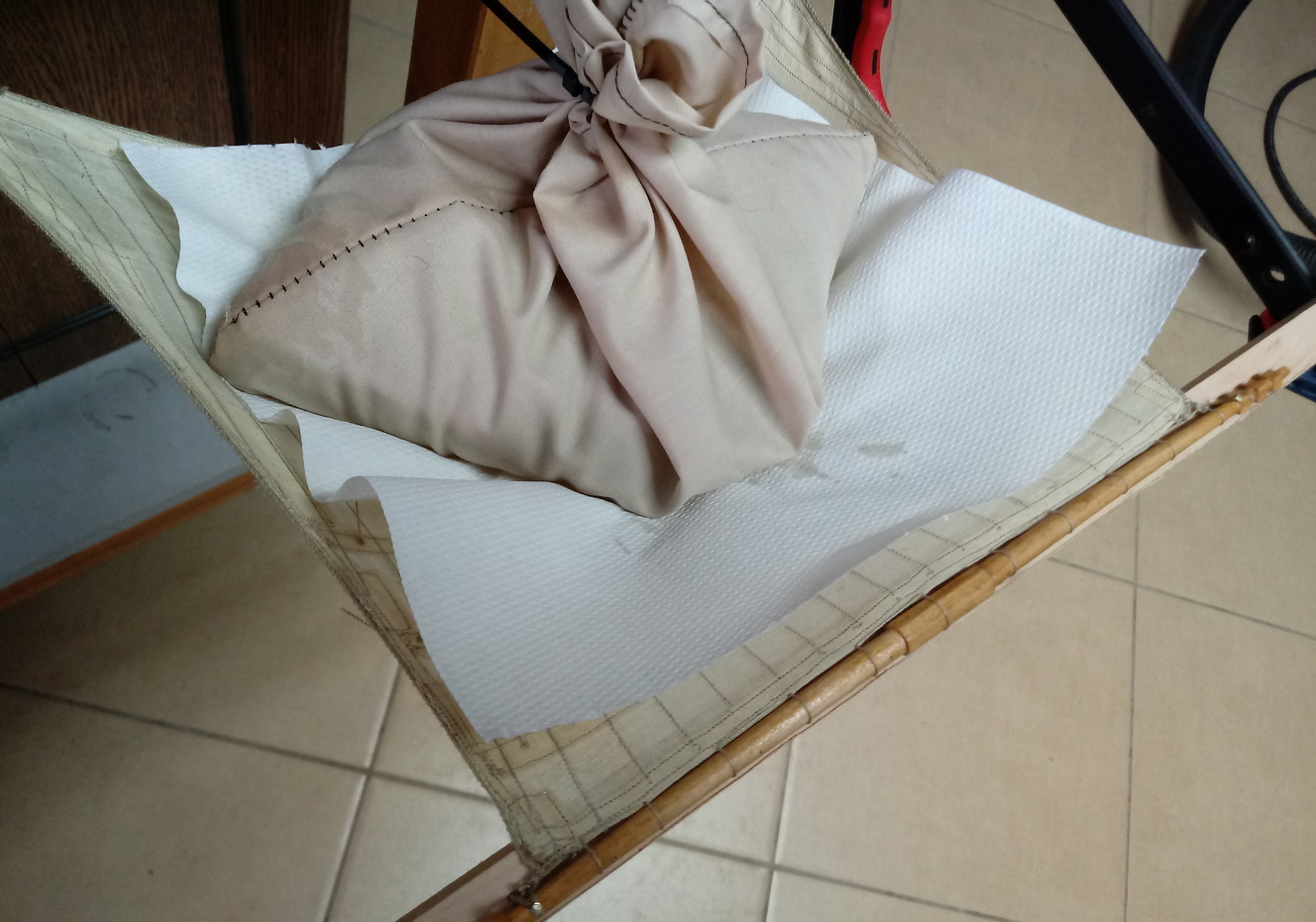 następnie woreczek z piaskiem. Papier służy za oddzielacz, żeby worek nie nasączył się lakierem.