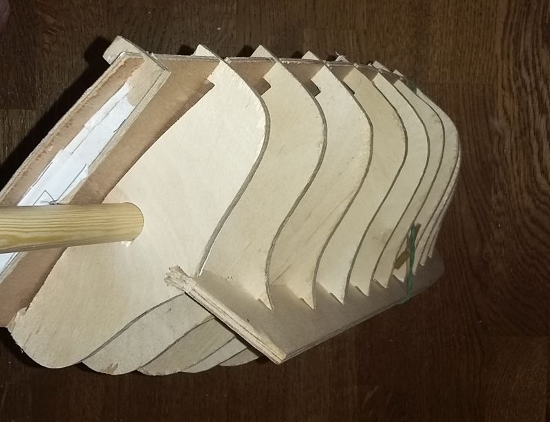 Pokład przypasował na strzał idealnie i przylega do każdej z wręg. Trochę przesadziłem z grubością ponieważ dogięcie będzie wymagać trochę zachodu ale strzałka ugięcia na rufie która jest zarazem górą tylnej skośnej wręgi wyszła igła. Oczywiście bez poprawek się nie obyło. Wręgę nr 0 będzie trzeba powiększyć po obwodzie o szerokość jej grubości. Ostatnią wręgę trzeba było podnieść o 3 mm bo się walnąłem w rysowaniu. Do stępki muszę jeszcze dokleić 1,5 mm do grubości i można już sklejać wszystko razem. Tak więc ogólnie jestem zadowolony Wymiar tego co poskładane 60 cm (długości bez dziobnicy bo dojdzie później) i 23 cm szerokości pokładu. Kawał balii wyjdzie :-)