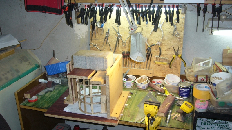 Prace podjąłem około 2 lat wstecz , na dzień dzisiejszy długość kilu 240 mm,długość sekcji 220 mm,szerokość w najszerszym miejscu 280 mm,wys bez masztów od kilu do końca nadburcia 250 mm,szerokość w najwęższym miejscu 240 mm.Ponieważ na dzień dzisiejszy prace są wykonane w około 80 procentach,będę wstawiał fotki od początku budowy.Pierwsza fotka stocznia ,pionowa.