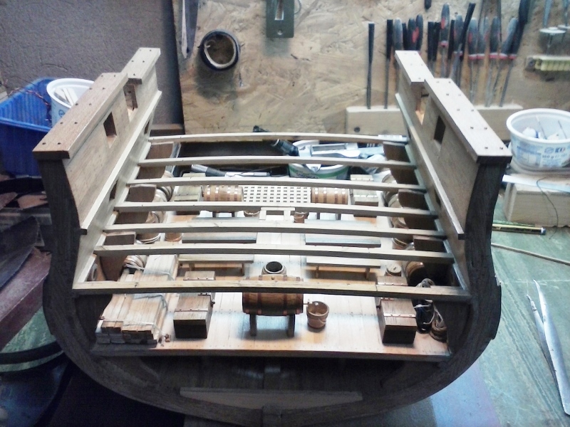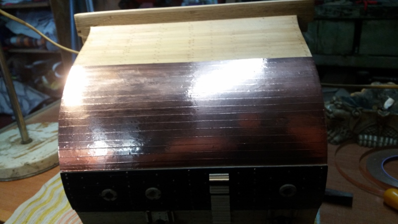 - Poszycie zewnętrzne od kilu do lini wodnej listwy brzozy ,odbojnica z dębu ,wstępnie poczerniona markerem powyżej listwy brzozowe do górnej wysokości ambrazur ,powyżej mahoń.Poszycie zewnętrzne i wewnętrzne będzie gwoździowanie , drutem miedziany fi 1 mm