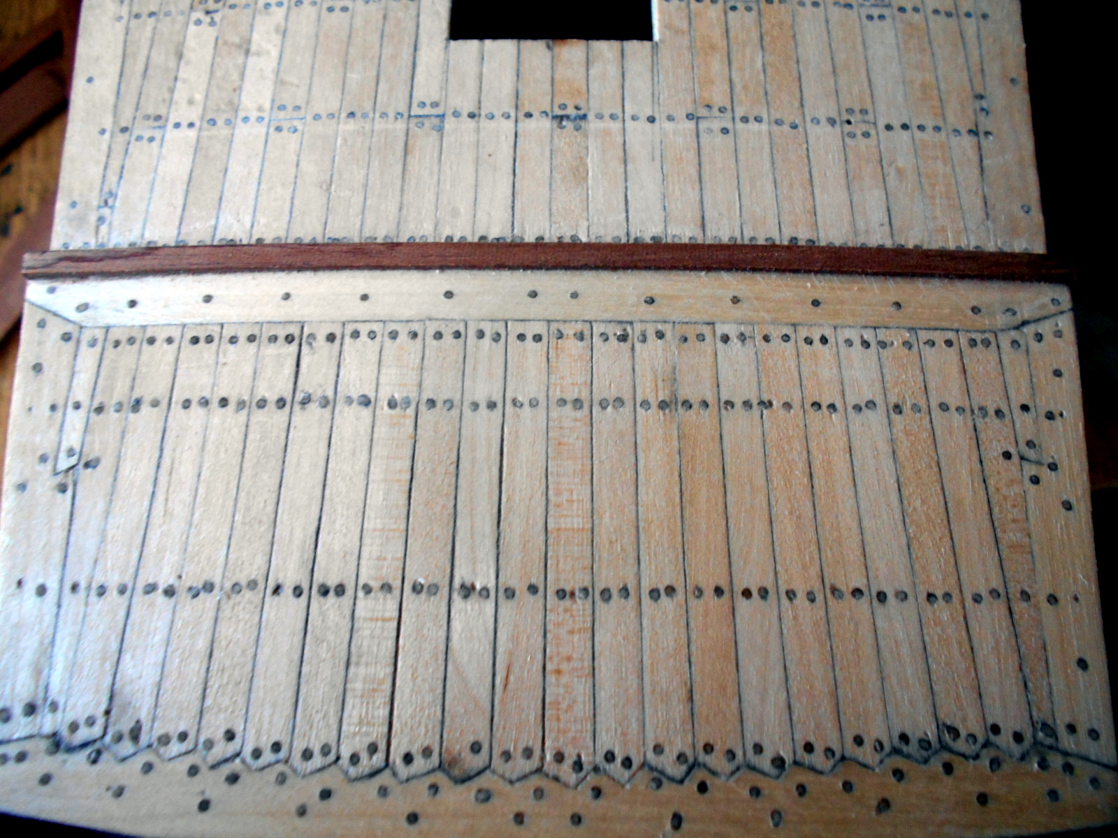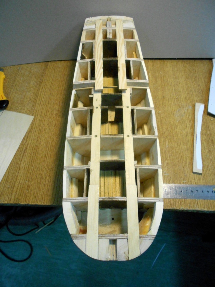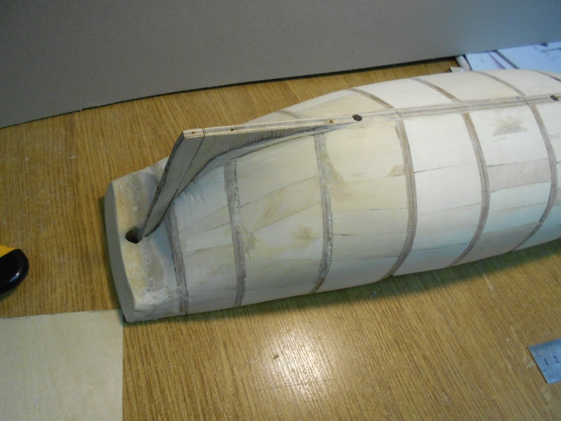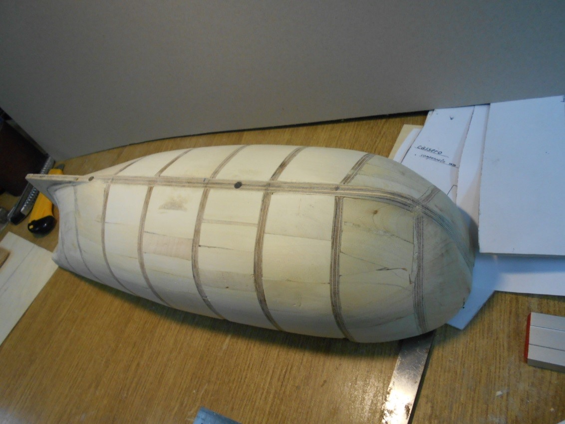 Wewnętrzne pokłady i ścianki w końcu zrobiłem. zacząłem powoli obklejać kadłub drewnem brzozowym.