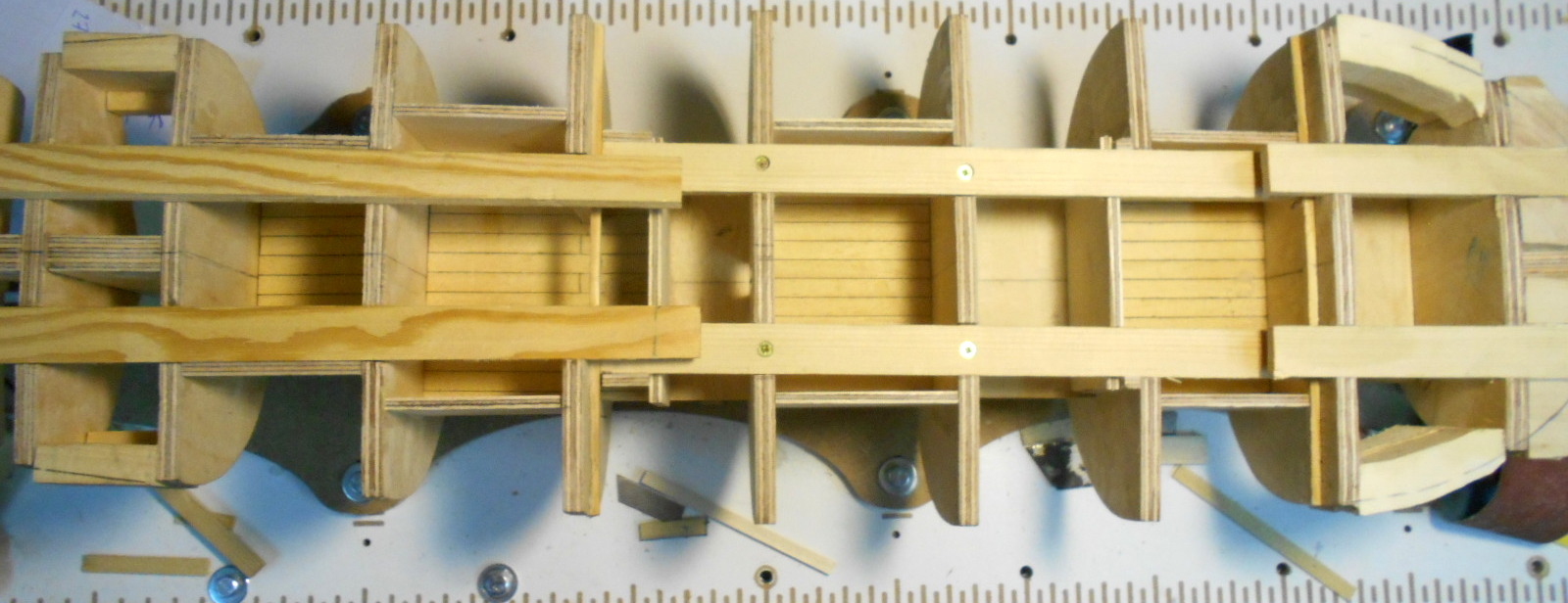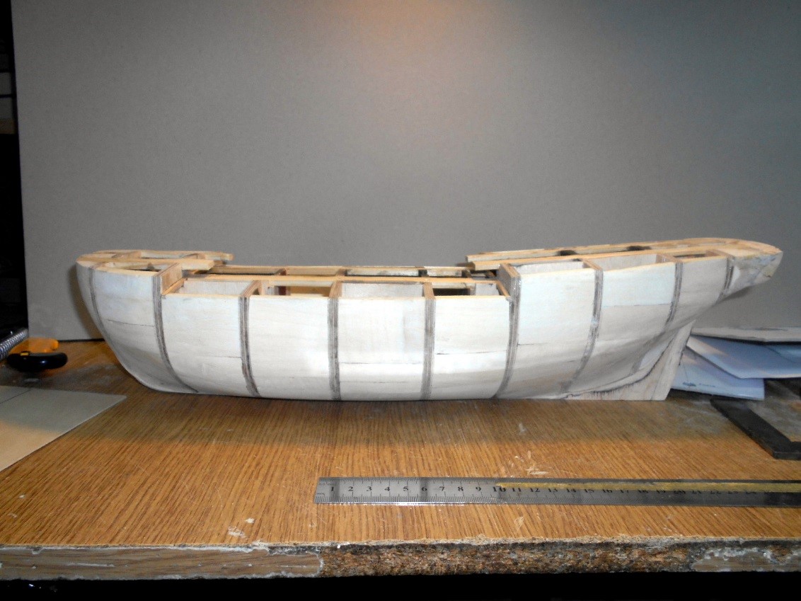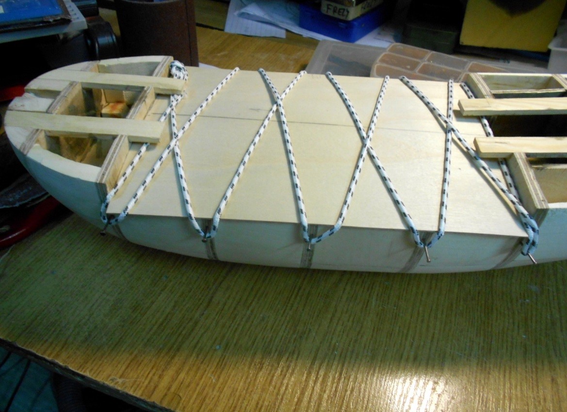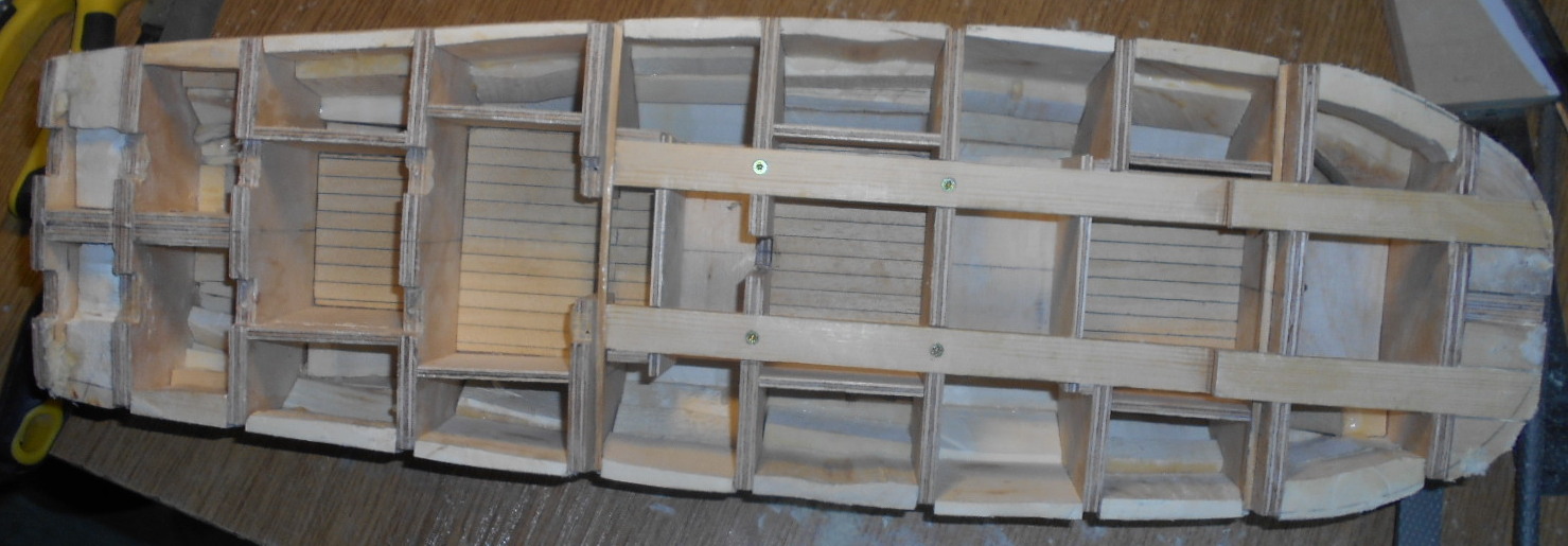 Wewnętrzne pokłady i ścianki w końcu zrobiłem. zacząłem powoli obklejać kadłub drewnem brzozowym.