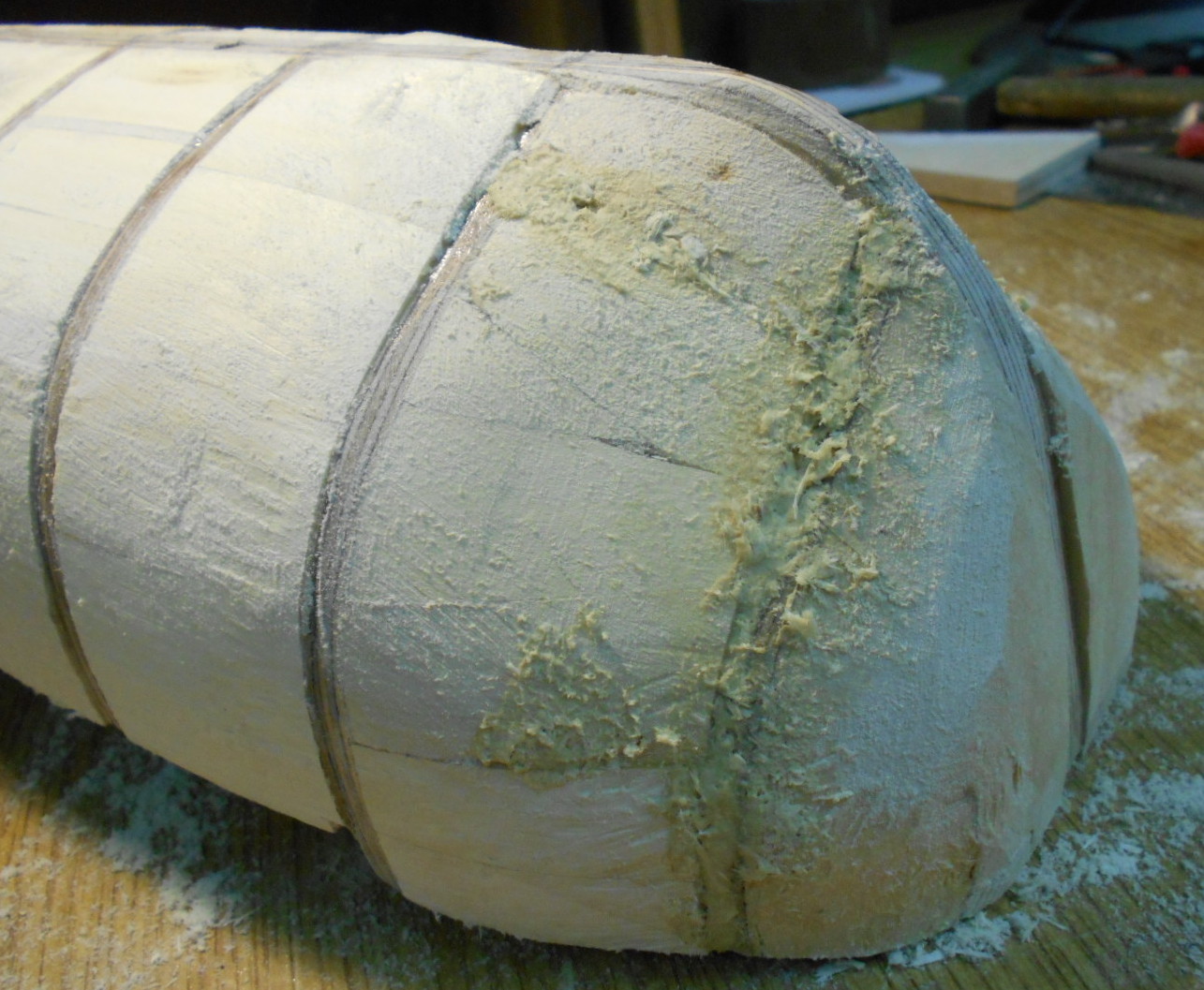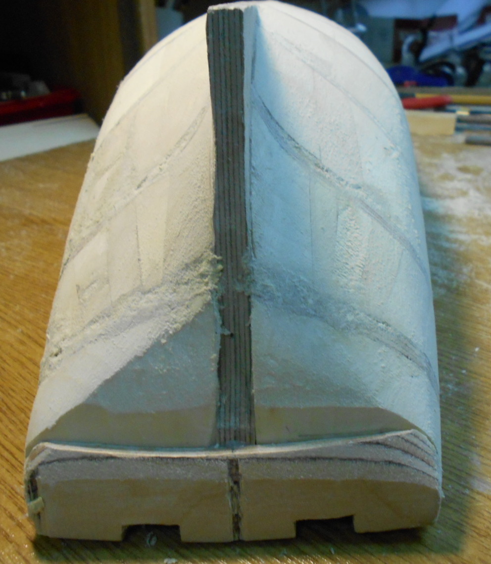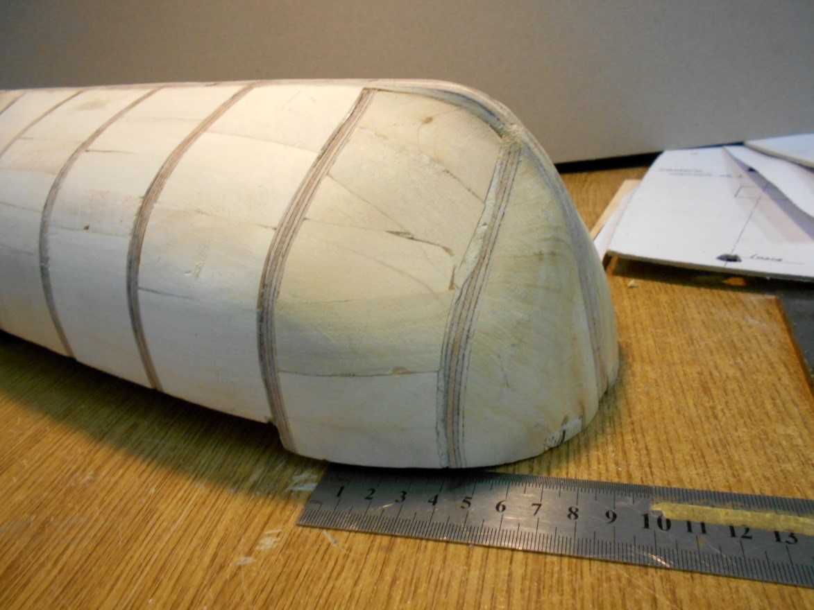 Powoli idę do przodu. Wypełniłem cały kadłub , a teraz żmudna robota szlifowania. Zauważyłem trochę błędów w dokumentacji . Znalazłem opinie o planach i faktycznie potwierdzają niektóre błędy. Trochę było niejasności z wykonaniem rufy , ale już dzięki znalezionej dokumentacji już powoli opanowuję. Użyta szpachla na wypełnienie niedociągnięć to wióry zmieszane z Wikolem.