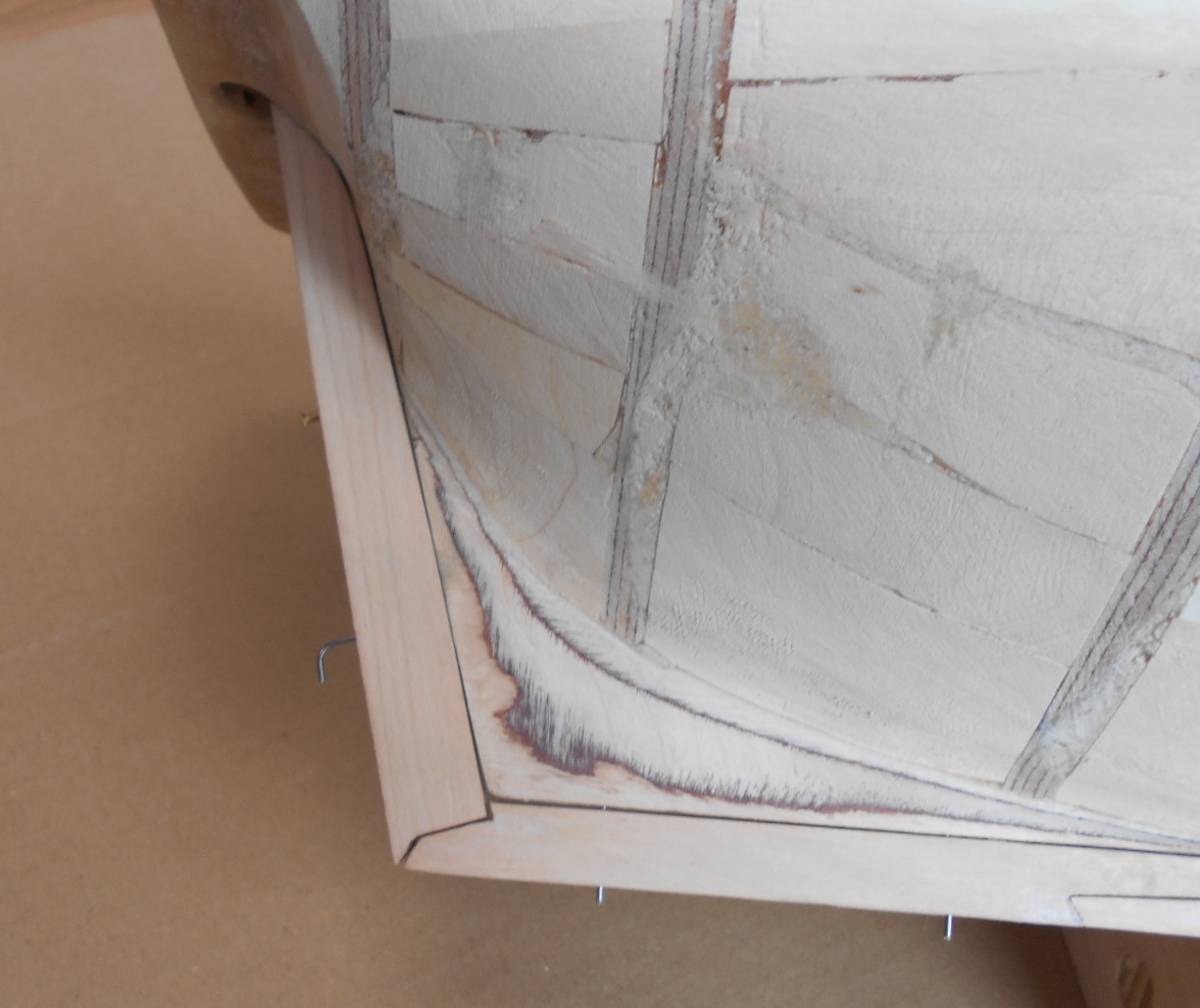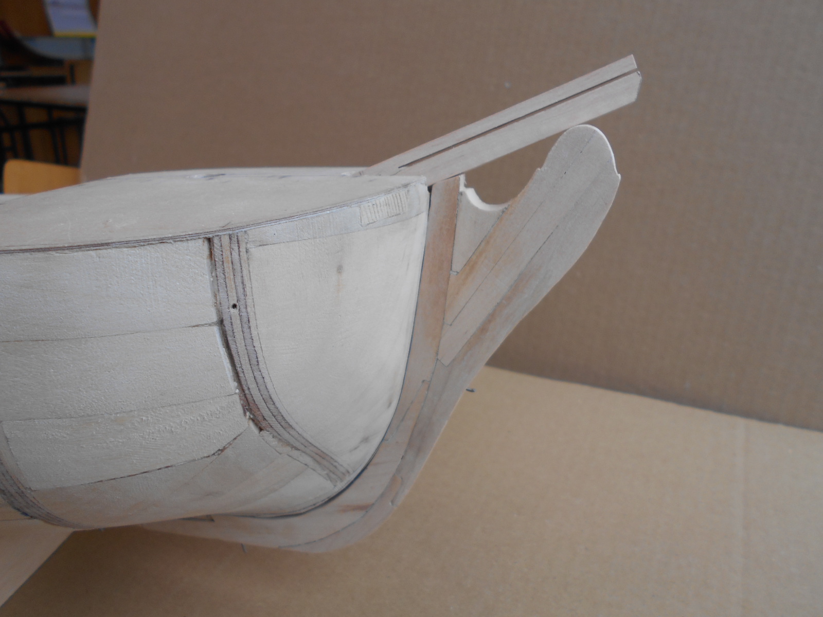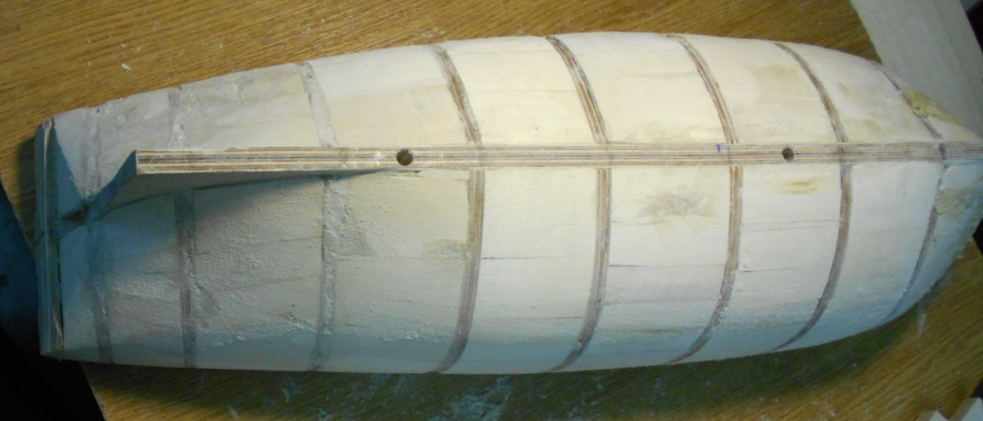 Powoli idę do przodu. Wypełniłem cały kadłub , a teraz żmudna robota szlifowania. Zauważyłem trochę błędów w dokumentacji . Znalazłem opinie o planach i faktycznie potwierdzają niektóre błędy. Trochę było niejasności z wykonaniem rufy , ale już dzięki znalezionej dokumentacji już powoli opanowuję. Użyta szpachla na wypełnienie niedociągnięć to wióry zmieszane z Wikolem.