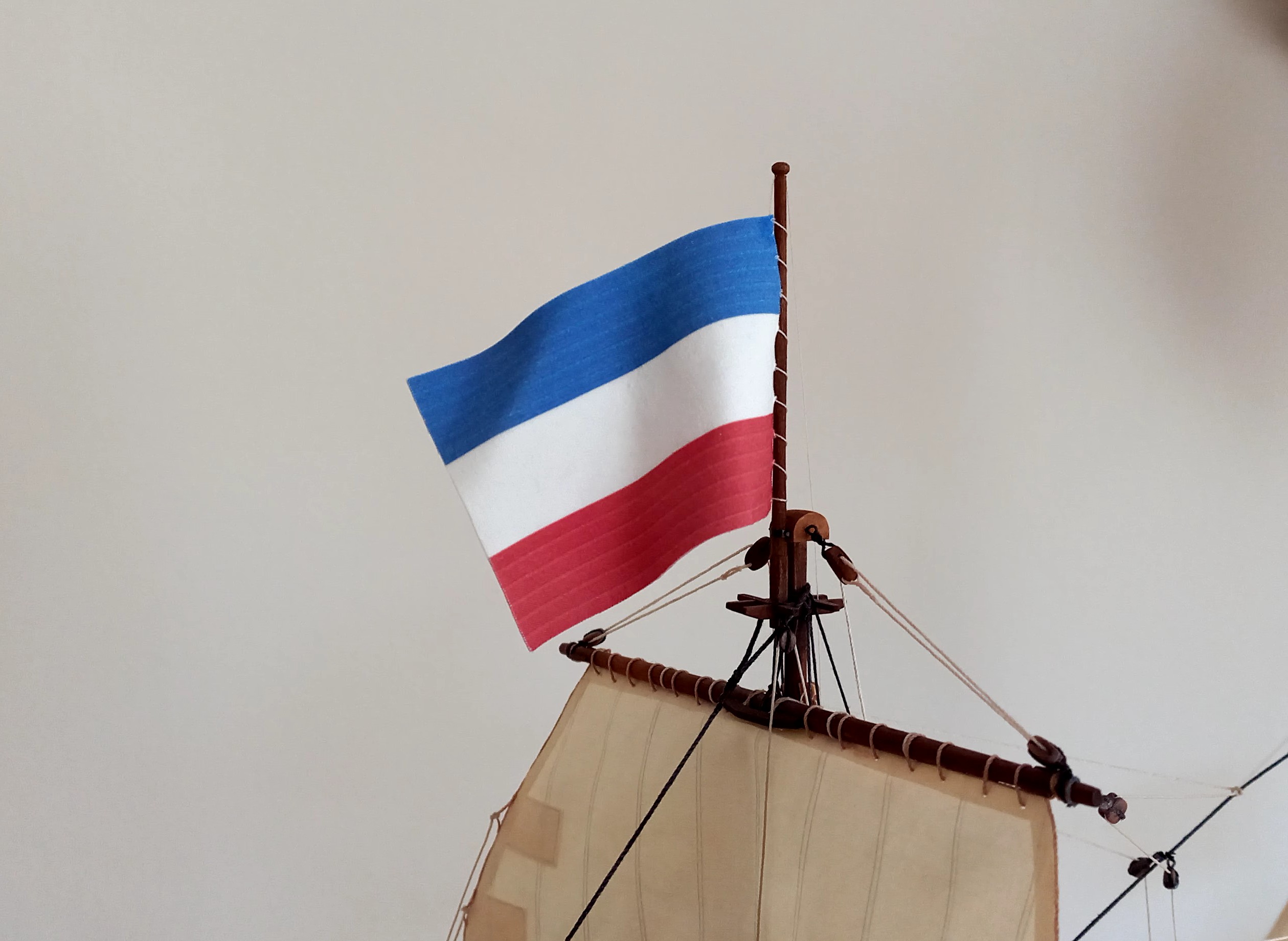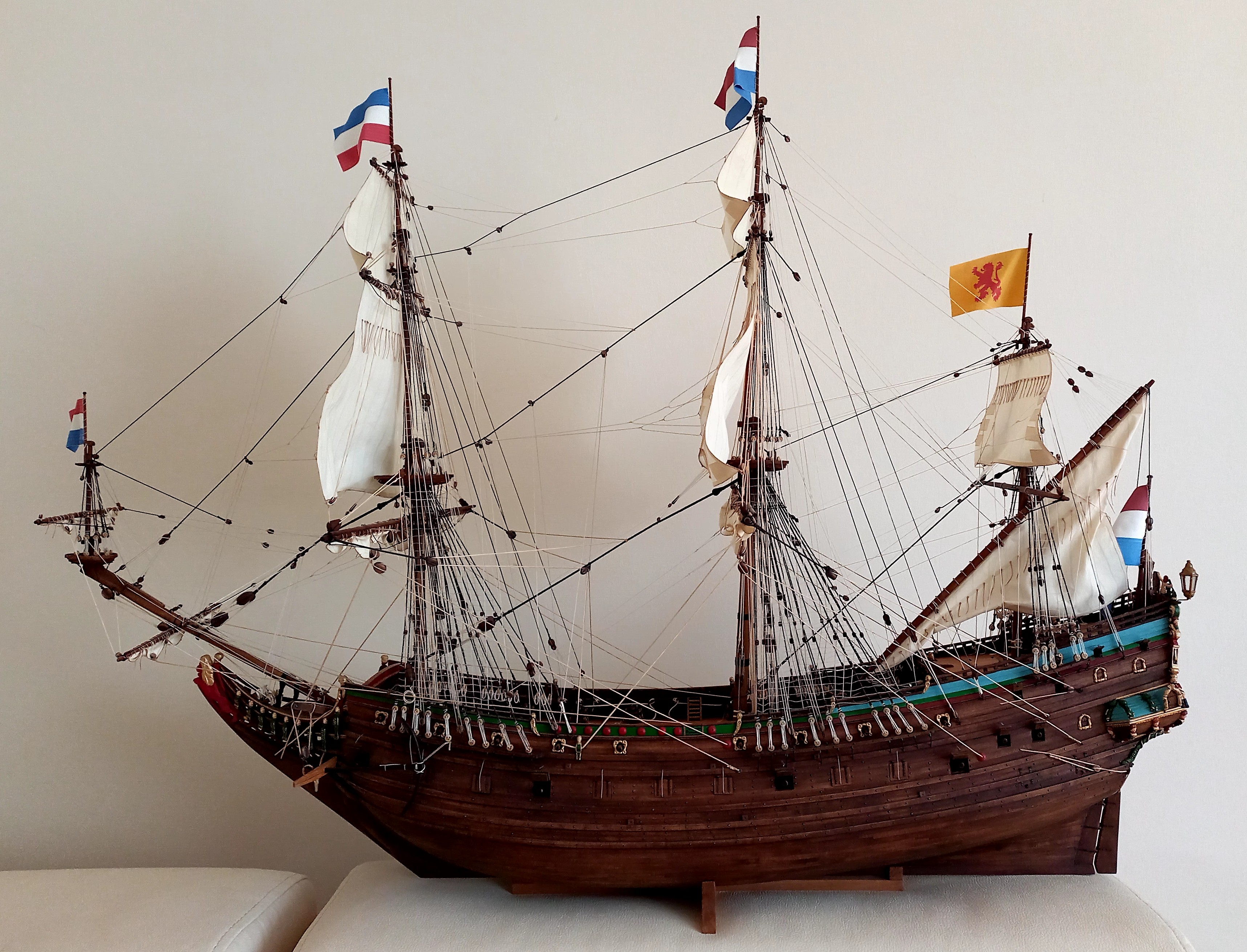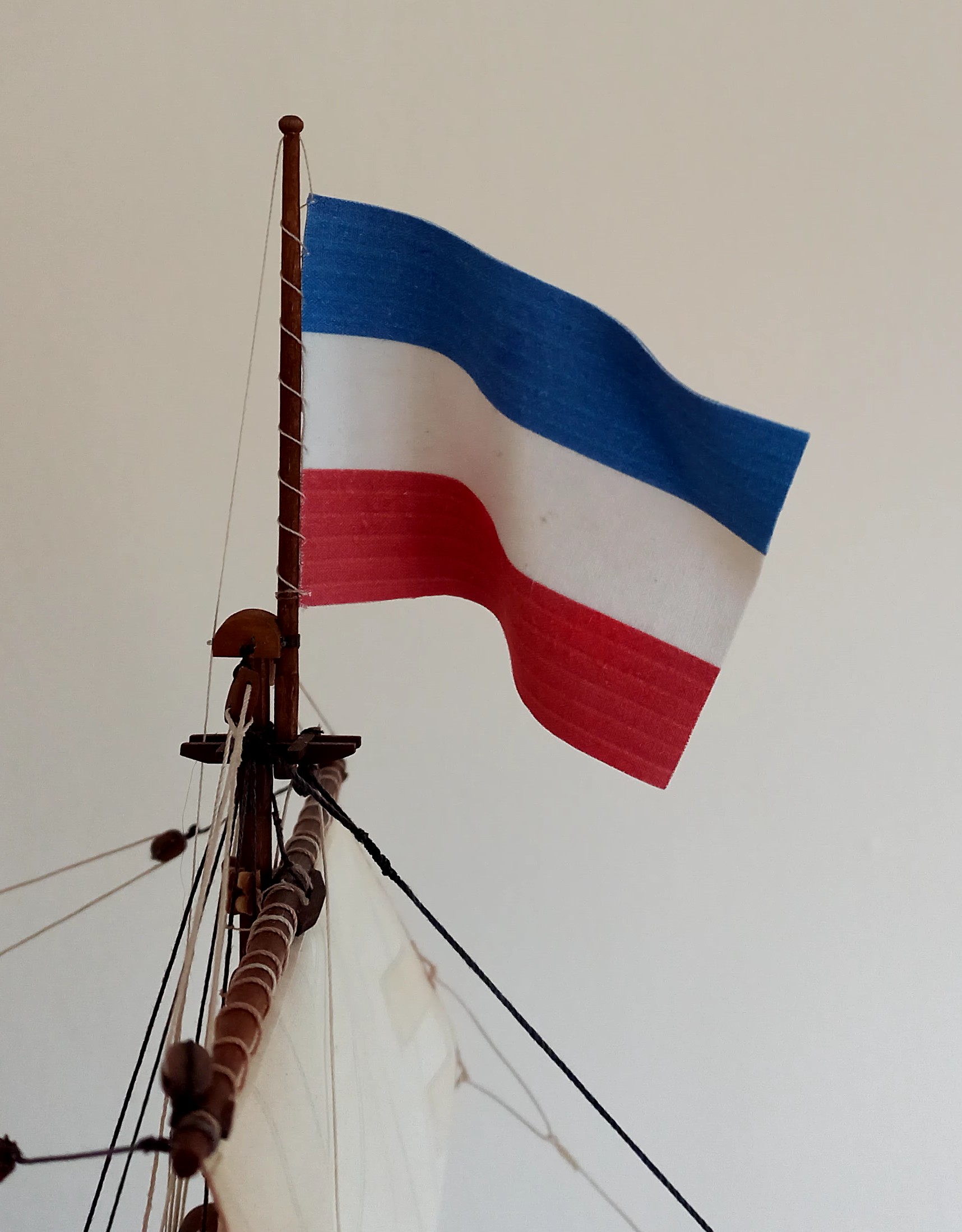 Wykonałeś kawał dobrej roboty. Model ma charakter i chyba kompletne olinowanie ( pomijam flaglinki). Model pięknie się prezentuje! Gratulacje! Janek