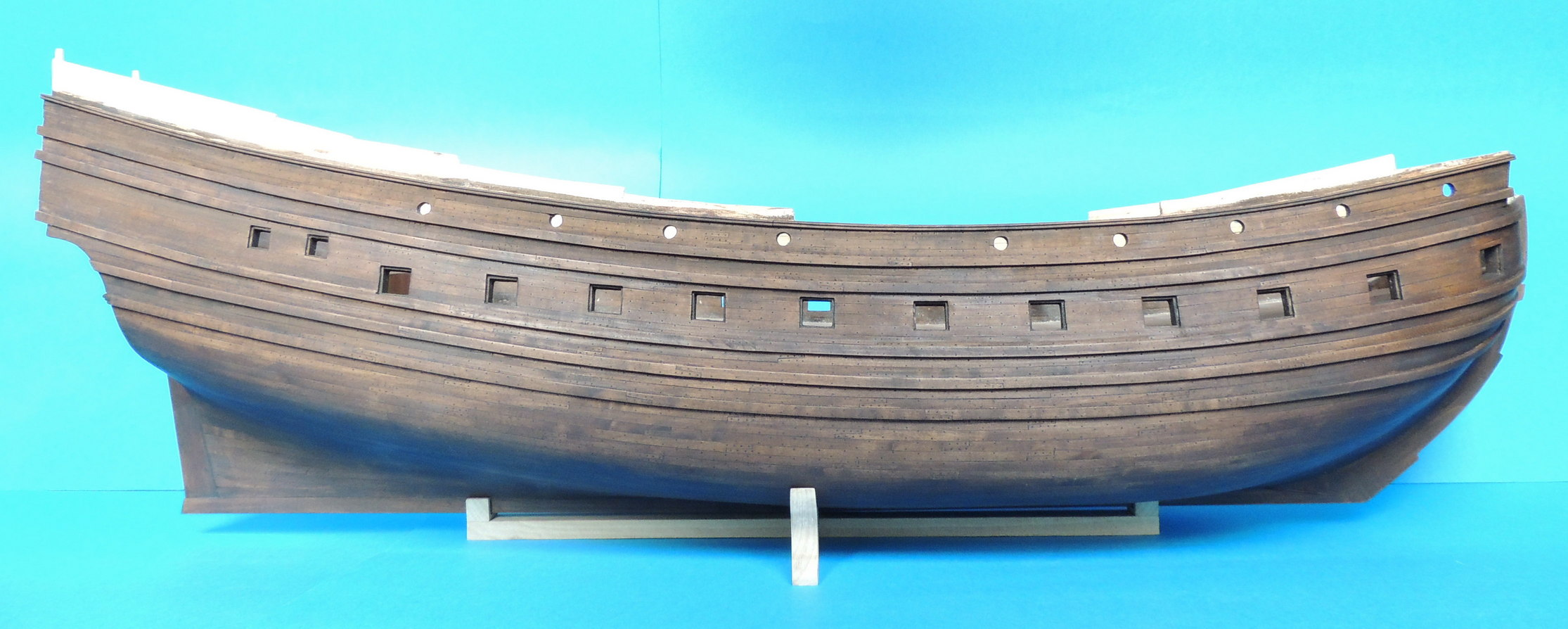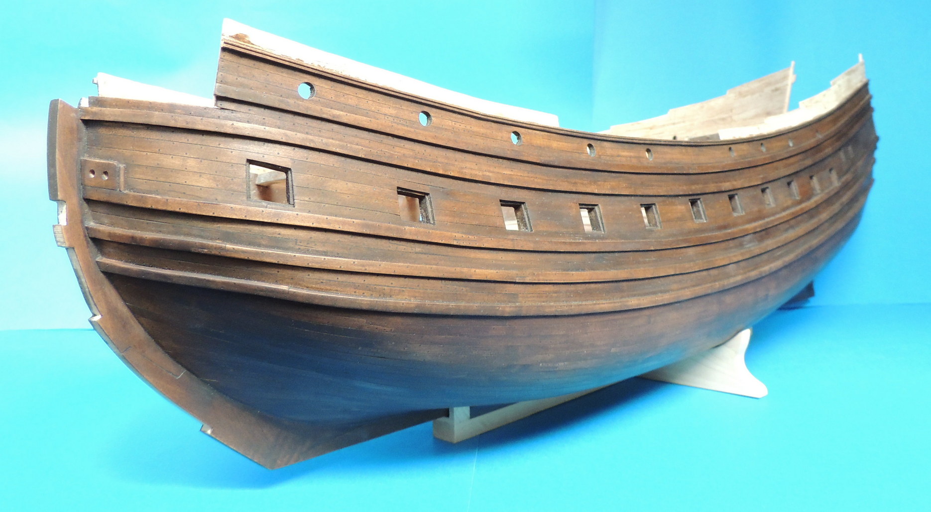 Odbojnice przyklejone. Wywierciłem otwory pod kluzy kotwiczne, i wstępne otwory ambrazur górnego pokładu. Jako że model nabrał już kształtów, zacząłem strugać dla niego podstawkę z prawdziwego zdarzenia