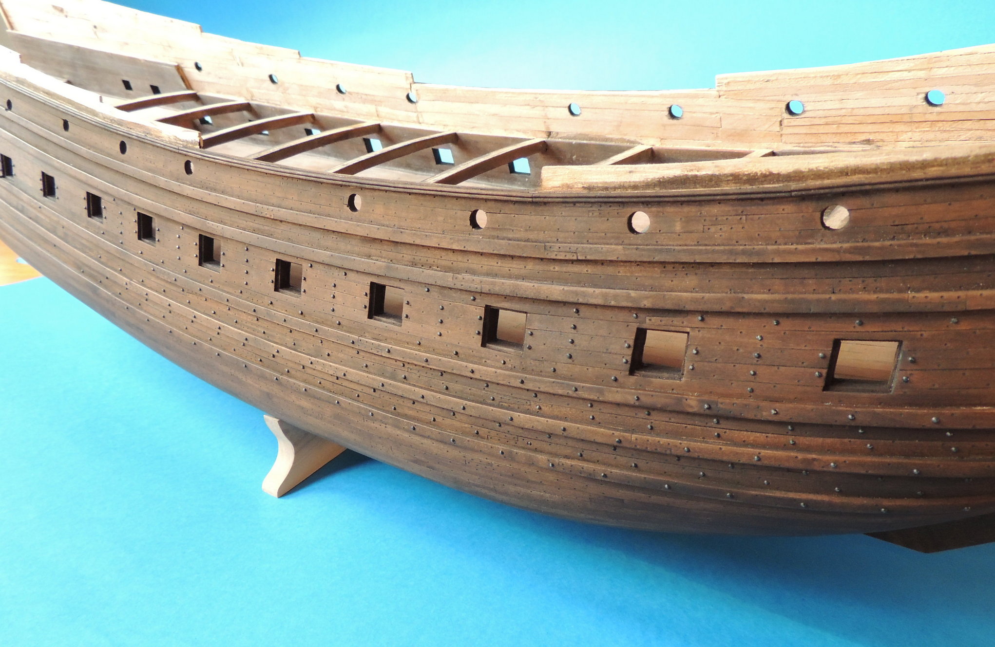Jedna burta gotowa. Nad drugą jeszcze pracuję. Z historycznego modelu wynika, że gwoździe nie były bite w całą burtę. Był to mniej więcej równoległy do linii wodnej, szeroki pas.