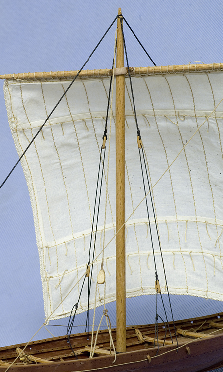 Kolega pytał o imitację kołkowania. Otóż nie jest to imitacja kołkowania ale nitowania :D . Łodzie wikingów były doskonałe, ale łodzie słowian także były doskonałe. Po prostu jedne miały lepsze to, drugie tamto. I właśnie łodzie słowian biły łodzie wikingów sposobem łączenia poszycia - były kołkowane, natomiast łodzie wikingów były nitowane żelaznymi nitami, a te korodowały. Jak zrobiłem nitowanie? Ano poszycie jest z forniru 0,6 mm, co daje 1,2 mm na łączeniu. Nie ma szans (przynajmniej ja nie potrafię) nawiercić i coś wstawić - nie kołki, bo to musi imitować żelazo. Początkowo chciałem zastosować sposób RomkaS z kropelkami kleju zabarwionymi na czarno, ale niestety, mimo kombinowania i sprawdzania różnych sposobów nakładania kropelek kleju, nie udało mi się uzyskać powtarzalnego efektu, kleksy były różnej średnicy. Więc w końcu zrobiłem to najprostszym z możliwych sposobów: Faber Castel 0,2 mm i punkciki są rysowane/malowane :D