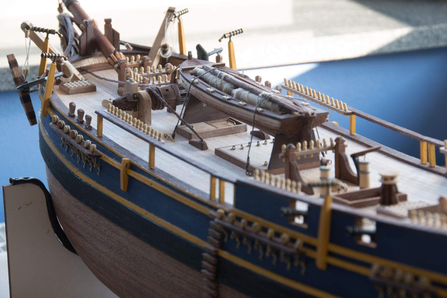 Hahaha, Hejtem się nie przejmuj. BUDUJ. Co się tyczy wypowiedzi Andrzeja to chyba dawno nie widział zestawu. Teraz walną kupę klapek i okrąglaków. Wytną wręgi które w przypadku mojego Bounty z AL a to uwaga seia ELITE po przyłożeniu listwewki miały różnice do uwaga !!! 4 mm. Żeby to wszystko wyprowadzić i ułożyć poszycie tak jak ułożycłem to zjada więcej czasu niż zrobienie swojego szkieletu albo przynajmniej tyle samo. Wszystkie drobne elementy jak słupki wzmocnienia rej kotbelki czy elementy wystające ze wzmocnień rej i inne wykonuje się samemu od zera z listewki którą raczyli dać. Nie ma tak, że bierze się do ręki i klei. Kiedyś w zestawie - a mam taki z AL z początku produkcji DADY II to wszystkie elementy faktycznie były wycięte frezem najprawdopodobniej na kopiale i można to bylo "sklejać" Teraz jak wydziubią laserem to zanim człowiek ogarnie tą spaleniznę to wyciąłby swoje. Przeróbki elementów z zestawu albo zupełna zamiana też pochłania czas. Czernienia coraz słabszymi oksydami dostępnymi w sklepach to następny czas juz nie wspominając o tym, że na elementach fototrawionych jest lakier którego lipne słabe ECO Nitro nie chce ruszyć. Trzeba wszystko rypać drobnoziarnistym papierem. To samo pręty mosiężne bo inaczej oksyda nie złapie. Na dobrą sprawę to nie wiadomo czy zebranie obecnie materiałów na wzór tych zestawowych droga zakupu nie wyszłyby drożej. Trzeba pamiętać że jak Angole wycieli u siebie wszystkie dęby to budowali ze sprowadzonych mahoniów i innych egzotyków wiec materiały zestawowe wcale nie są aż tak głupie w pojęciu historycznym. Nie da się nie pracować narzędziami, myśleć i kombinować. Ja na moim Bounty zacząłem stawianie żagli masztów i want od ostatniego tylnego masztu i tak samo ożaglowanie. Trzeba pamiętać, że przynajmniej w AL było pełne olinowanie a to nie ma zmiłuj. Nie ma potem jak ręki włożyć. Jak będziesz montował podwójne talie do pokładu w okolicach masztu to nie wklejaj oczek w pokład samodzielnie ani nawet z bloczkami. Całą talię dopasuj po długościach i przewlecz wszystkie liny i dopiero z oczkiem wklej w pokład. To jest ważna uwaga !!! Pokuś się o samodzielne rozplanownie lin na kołkownicach . Jak już będziesz miał wszystkie to możesz zawsze poprzekładać. Nie ucinaj przy kołkownicy zanim nie skończysz całego olinowana ruchomego i tych które schodzą do ław wantowych ( bo i takie powinny być a lina była buchtowana i składana na ławach wantowych ) W zakresie przywiązywania do kołkowic dokumentacja w AL i w Occre jest zrobiona bardzo na oko. Wiadomo, że w miarę możliwości liny biegnące w marę pionowo powinny być równolegle do siebie a nie się krzyżować i nie powinny przebiegać przed wantami tylko za bo inaczej marynarze mieliby problem z bieganiem po drabinkach - wyblinkach ponieważ przechodzące liny by im przeszkadzały. Walcz i powodzenia. Nie daj się ponosić niecierpliwości i montować co popadnie żeby zobaczyć efekt tak jak to zrobiłeś z rejami. Powolne kroczki dadzą efekt końcowy a czasem i 3 razy wykonany detal nie jest zadowalający. To jest modelarstwo więc nie ma się co spieszyć. Każdy detal wykonany na odwal się i tak potem będzie Cie kuł w oczy
