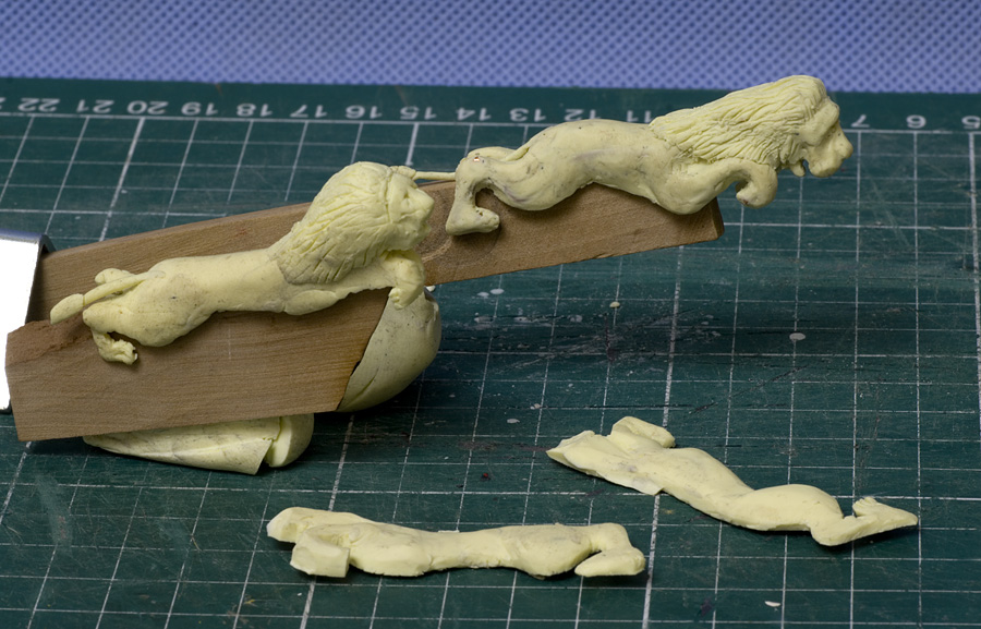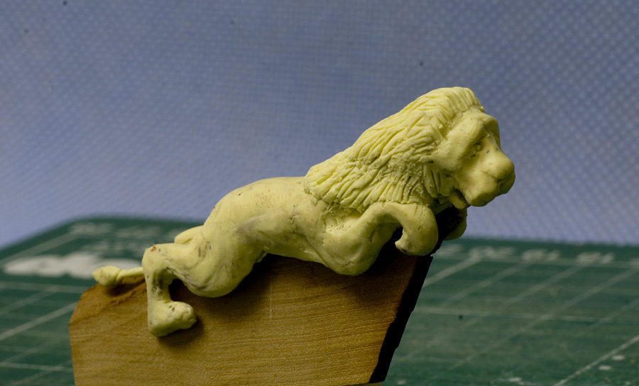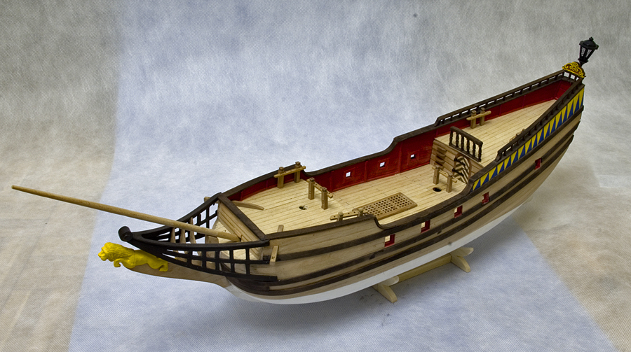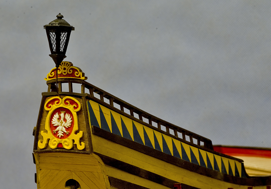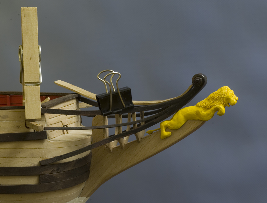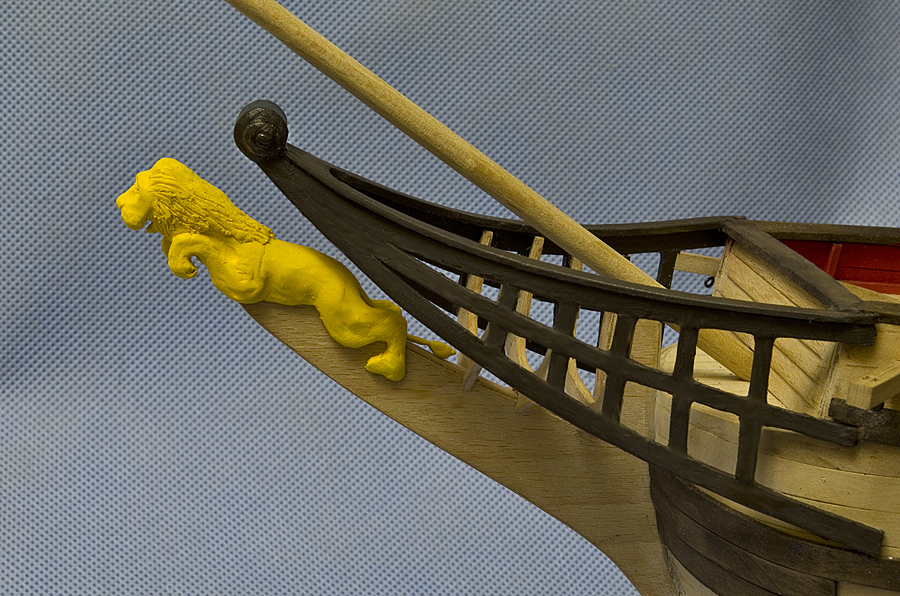 Ciąg dalszy zabawy w rzeźbiarstwo. Trochę znów kombinowałem, próbowałem, mierzyłem się z rzeźbą galionową. Znów parę prób, parę porażek aż w końcu wyszło coś, co trochę lwa przypomina. I choć Jurek Borwiński (autor planów i zestawu) na swoim wzorcowym modelu ( przy opisie zestawu w Modelarzu 11/2009) zrobił lwa złotego, to ja jednak stwierdziłem, że skoro to ma być Żółty Lew, to ja go popsikam na żółto. i tak to wyszło: