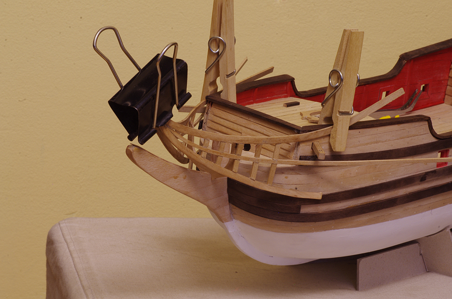 Długo trwała zabawa z klejeniem kosza dziobowego. W sumie dopiero trzecia wersja kosza jako tako mnie zadowoliła i ostatecznie znalazła się na modelu.