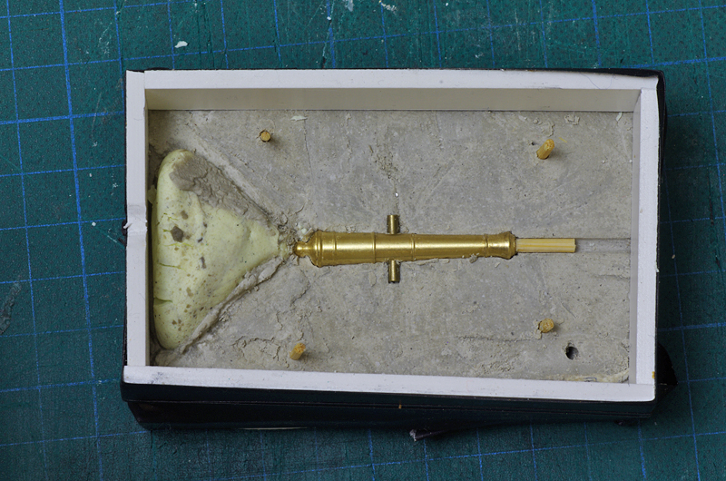 Ostatnio zajmowałem się ludwisarstwem. Swego czasu zakupiłem rozmiarówkę armat, coby mieć jako formę... ale okazało się, że nie mam tego właściwego rozmiaru. Wg planów powinna być lufo ok 45 mm, ale wtedy całe działo jest za duże, nie dałoby się go nabić, bo w wycofaniu na pokład przeszkadzałby greting. Uznałem, że najbardziej odpowiednie będzie lufa 40 mm... no ale takiej nie miałem. Zakupiłem więc od razu dwie takie lufy i zabrałem się za robienie formy. Tradycyjnie forma z gipsu modelarskiego, jako separator zastosowałem masło. Forma jednak cosik nie taka była, wytrzymała ledwo 2 odlewy i wykruszyły się brzegi. Więc zrobiłem następne, tym razem dwie formy, tu jako separator zastosowałem WD 40. Oczywiście po zaschnięciu dolnej części formy, przed zalaniem góry pogłaskałem dolną część glaspapierem... no i leję dziś, leję, już mam nadkomplet luf, ale skoro formy jeszcze wytrzymują, to leję na zapas :D. Oczywiście konieczne będzie jeszcze pogłaskanie onych raszpelkiem.