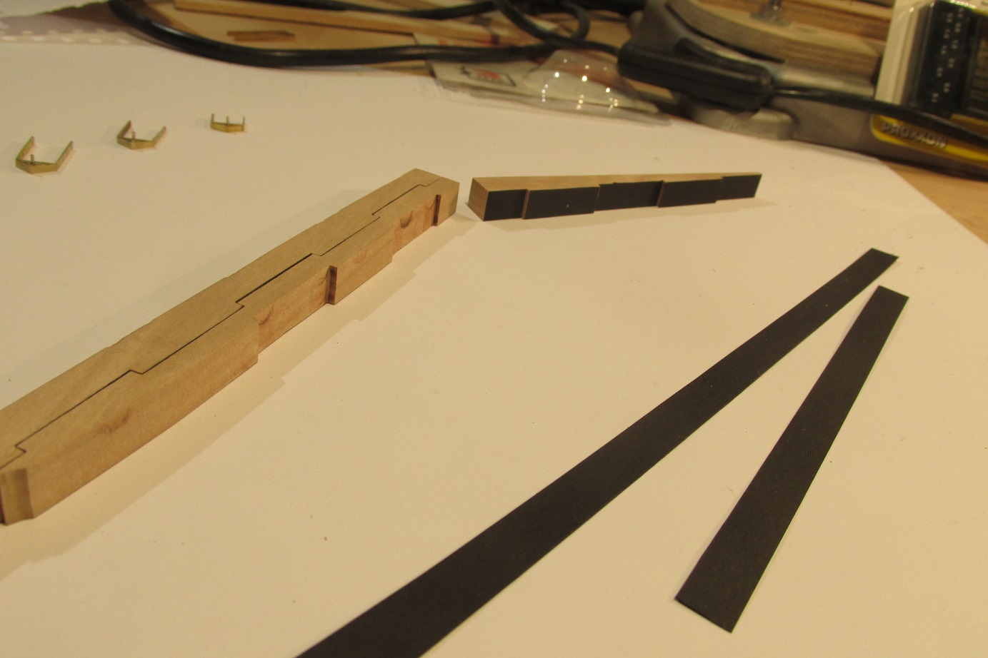 Wszystko powoli zmierza do malowania, jeszcze tylko kołkowanie burt w okolicach furt działowych oklejenie taśmą i malowanie. W części dennej wbiłem ponad 5000 kołków drewnianych, na odbojnicach kołki z drutu miedzianego fi 0,5 mm.