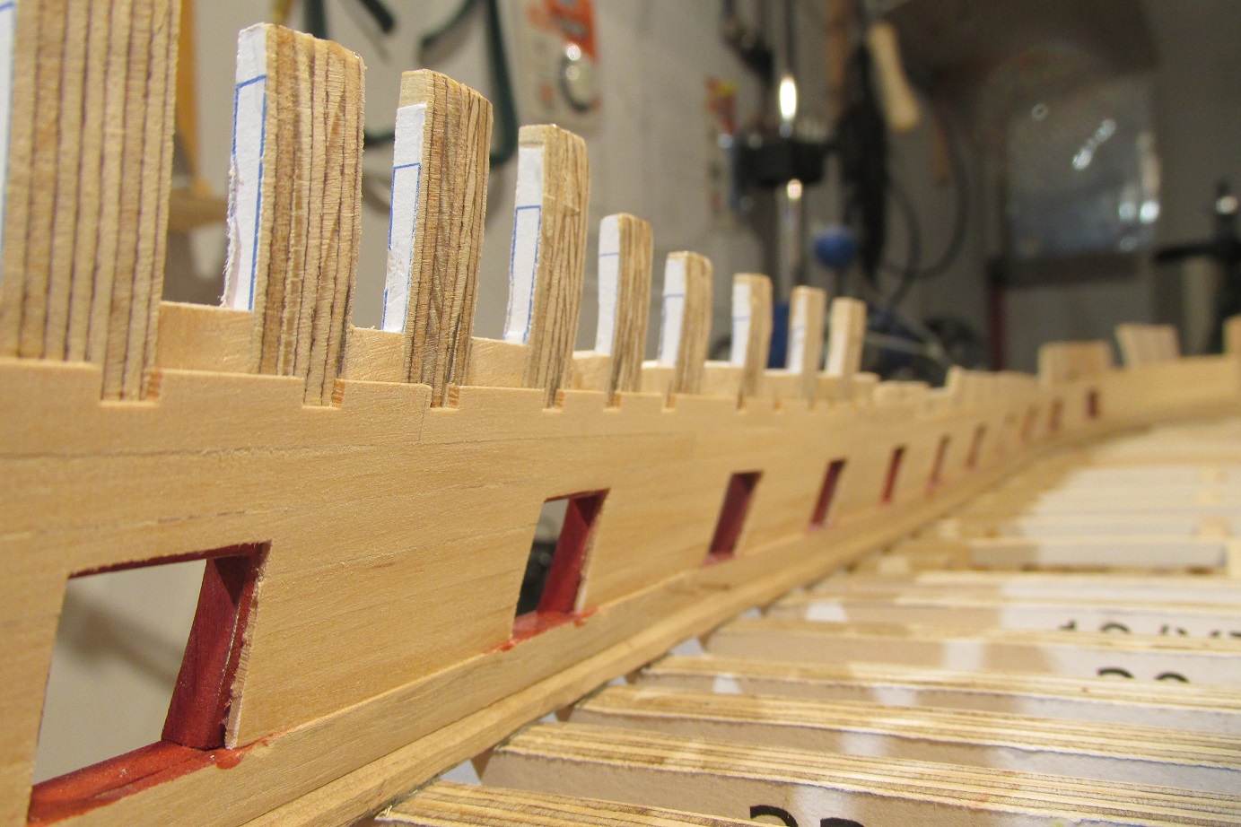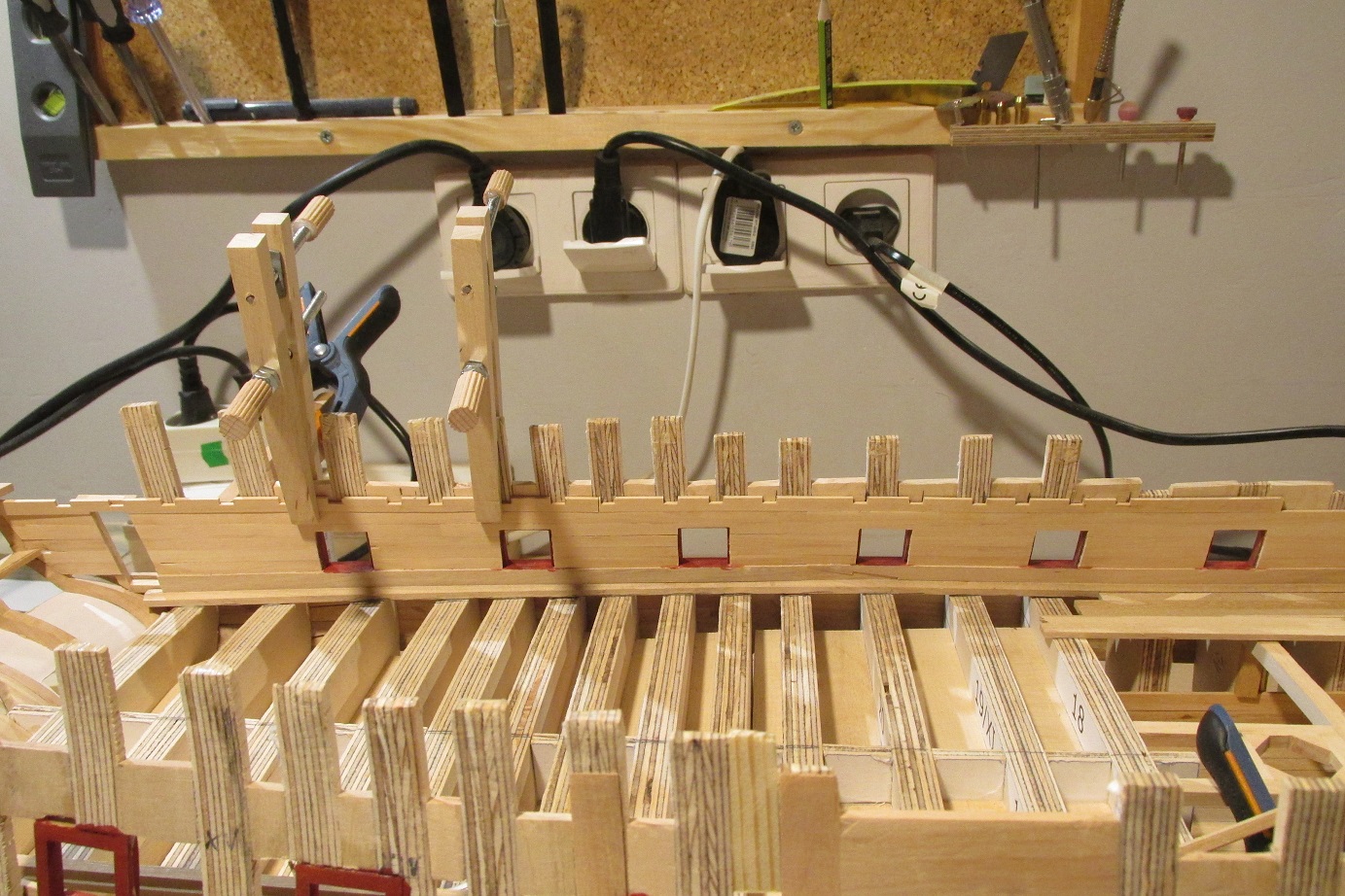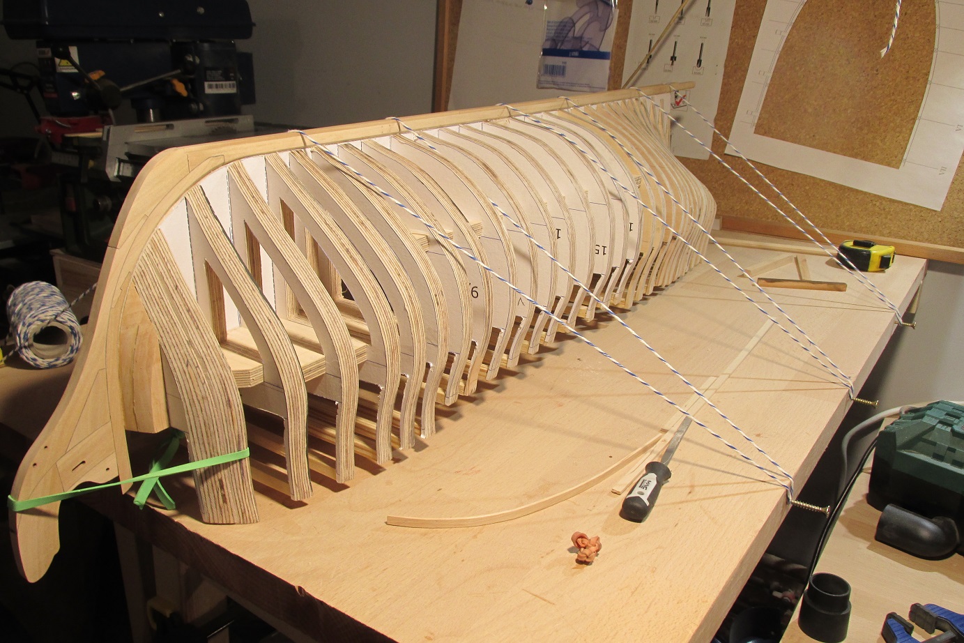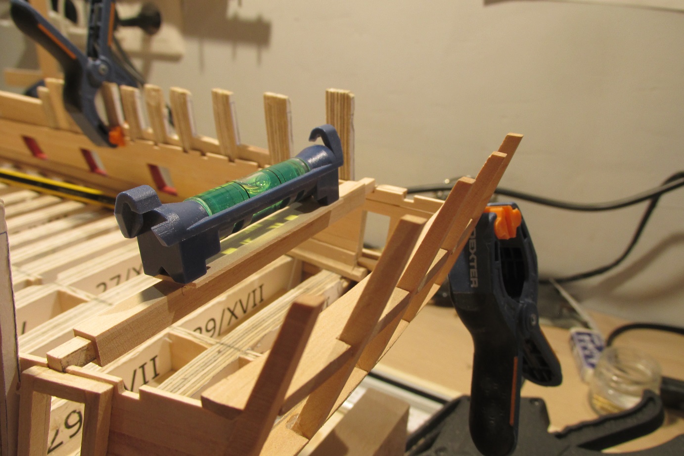 taki ruchomy pokładnik o zmiennej długości. Ponieważ przyszedł czas na przyklejenie ostatnich listew poszycia wewnętrznego, trzeba było wypoziomować pokładniki i wyznaczyć ich położenie na przeciwległej burcie.