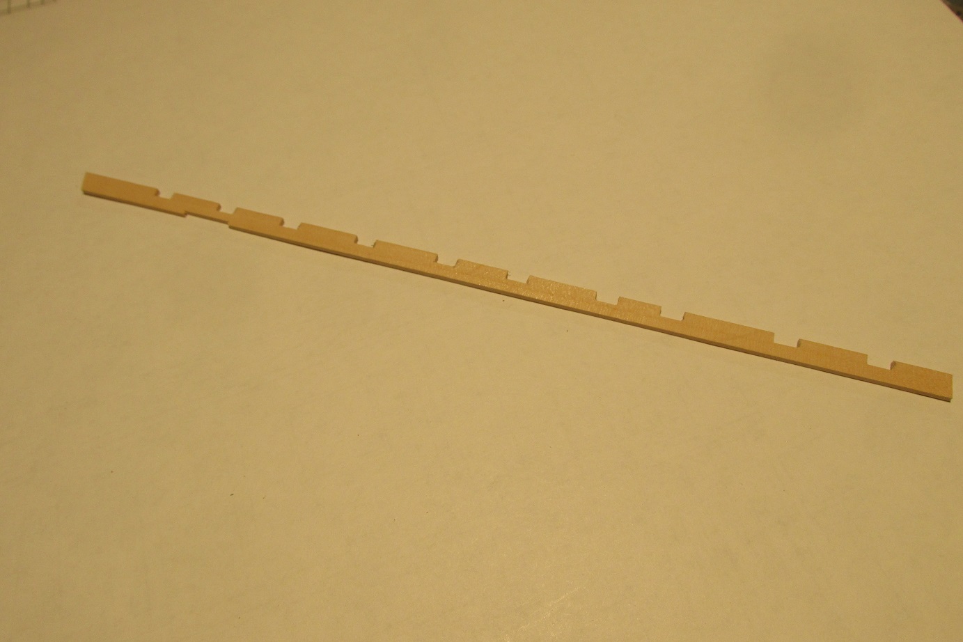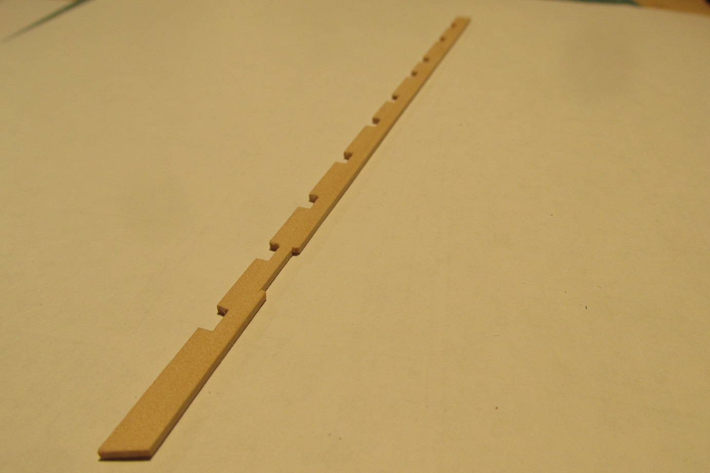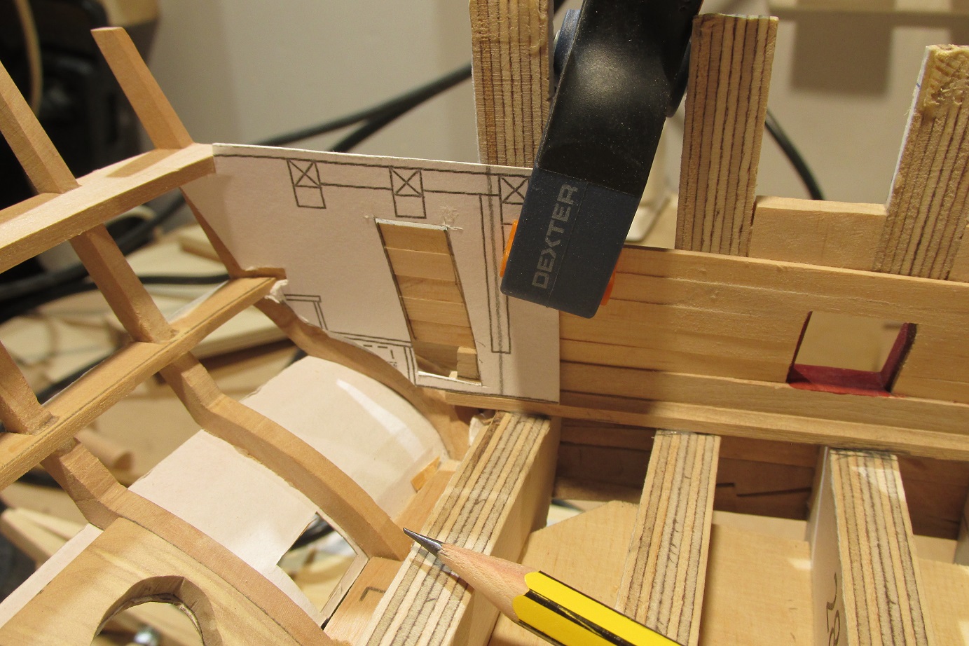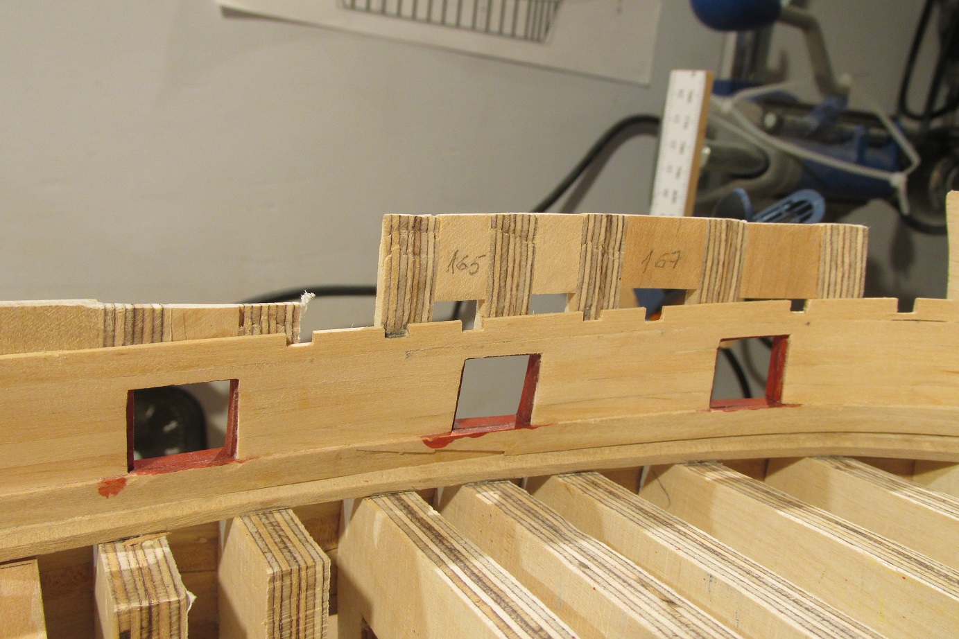taki ruchomy pokładnik o zmiennej długości. Ponieważ przyszedł czas na przyklejenie ostatnich listew poszycia wewnętrznego, trzeba było wypoziomować pokładniki i wyznaczyć ich położenie na przeciwległej burcie.