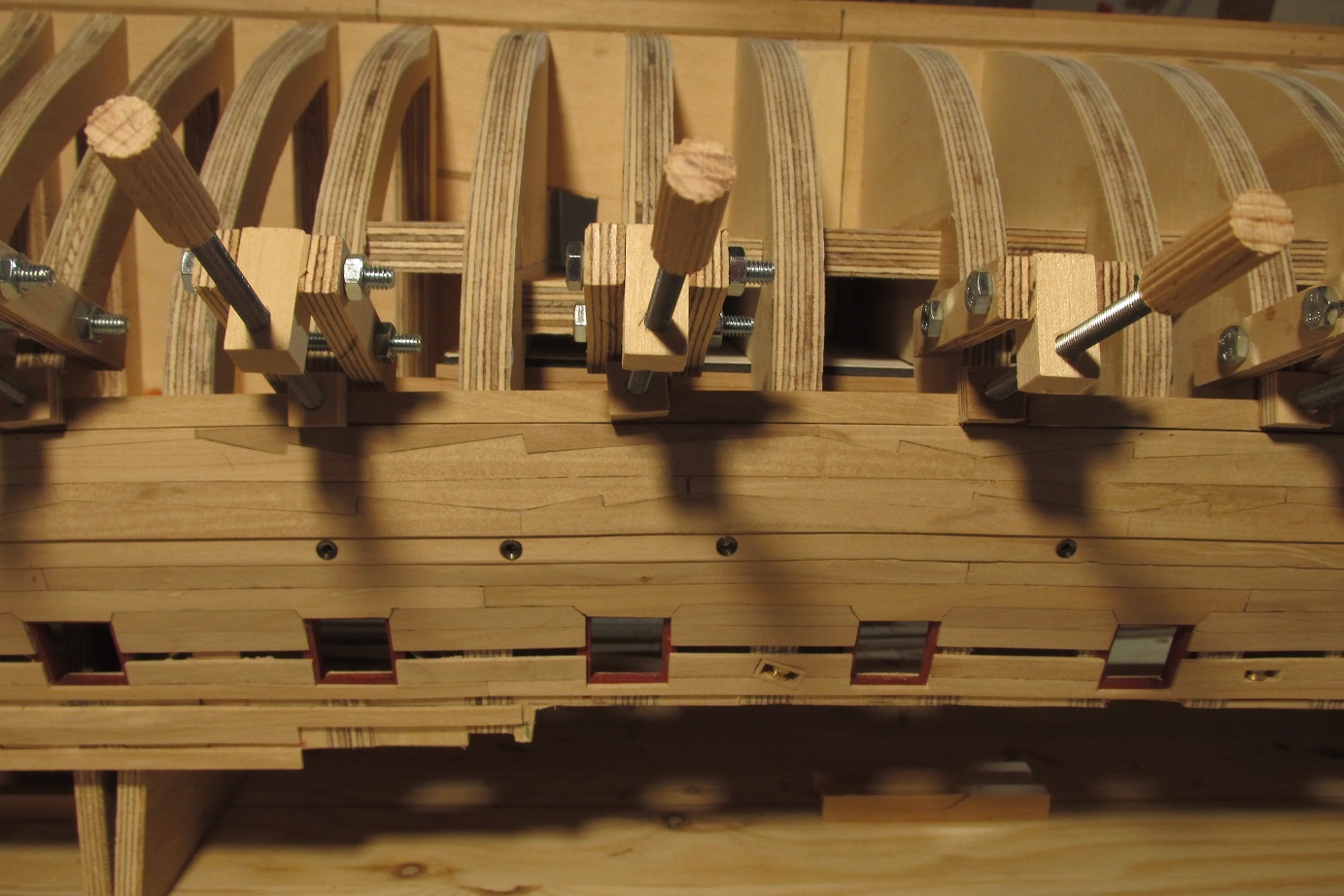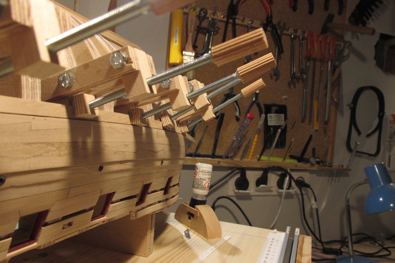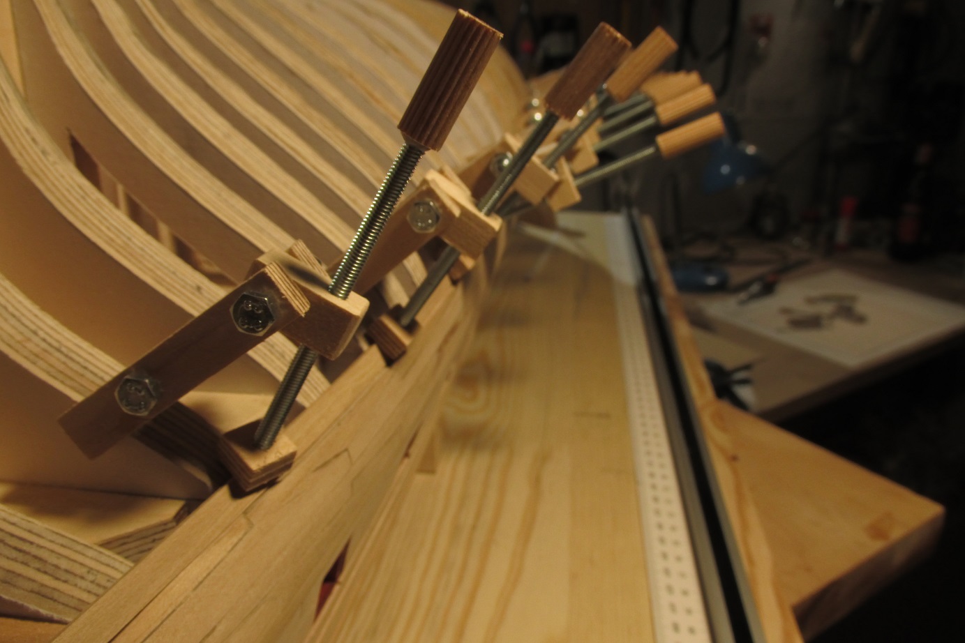 A ja się ciągle przygotowuję do poszywania dennej części burt. Wyrównałem pas odbojowy i wymyśliłem dociski, których działanie przerosło moje oczekiwania. Ich zaletą jest to że dadzą się użyć prawie w każdym miejscu poszywanego kadłuba.