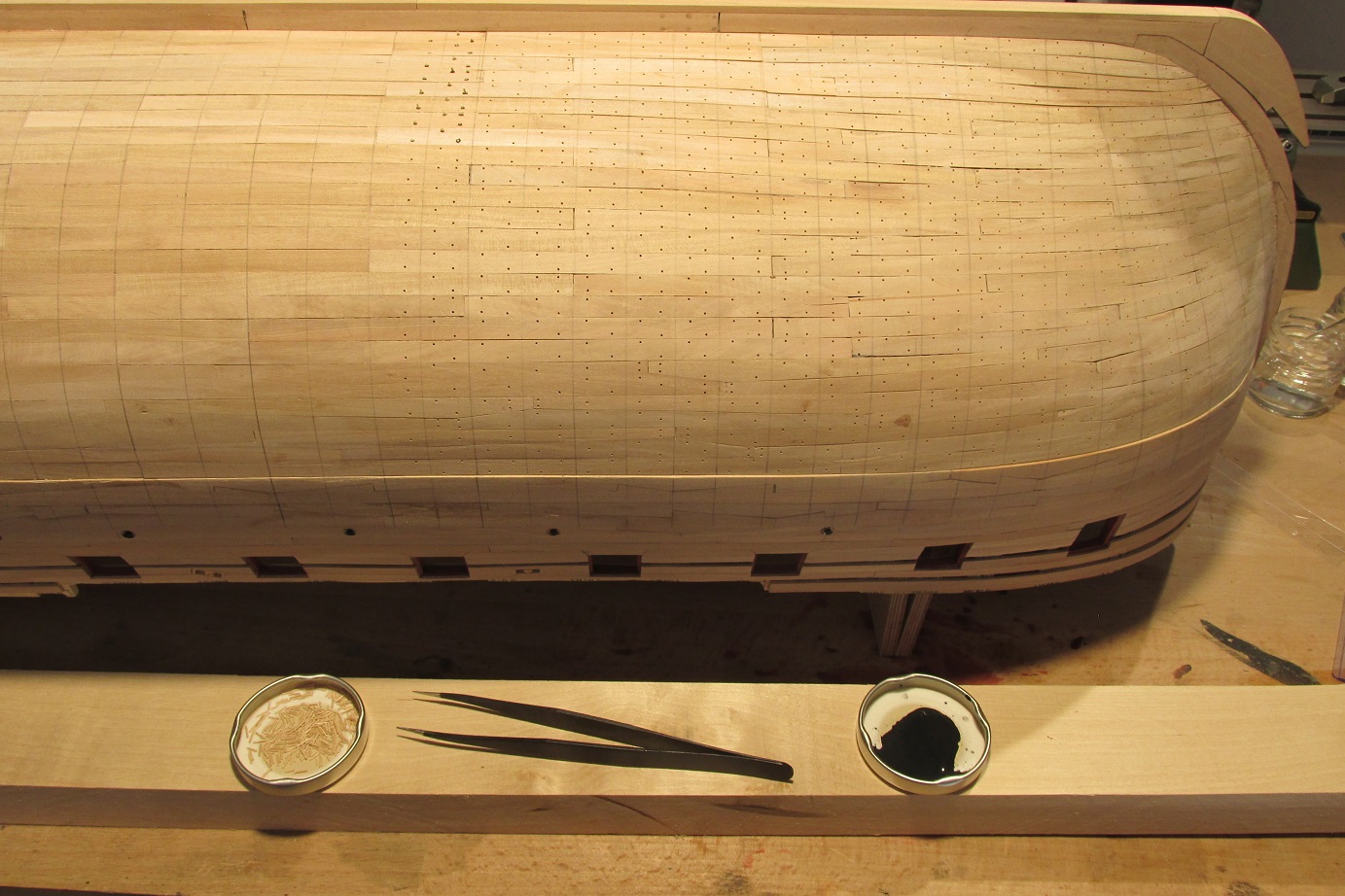 Tu z przed szlifowaniem kadluba wcisnij w szpary miedzy plankami cienka struzke kleju do drewna i nie czekajac az wyschnie szlifuj papierem sciernym sredniej gradacji. Pyl od szlifowania wejdzie na klej w szpary, ktore beda prawie niewidoczne.
