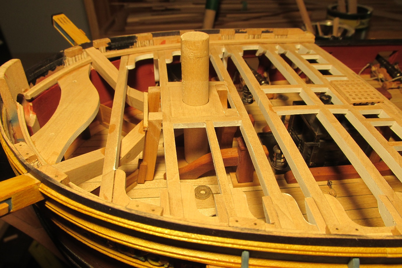 PS: Super fajny model Ci wychodzi! :o Tylko usun te beczki miedzy dzialami - to nie jest dlan odpowiednie miejsce (beczki z woda byly typowo skladowane w miejscu zwanym HOLD pod dolnym pokladem (tzw. orlop deck).