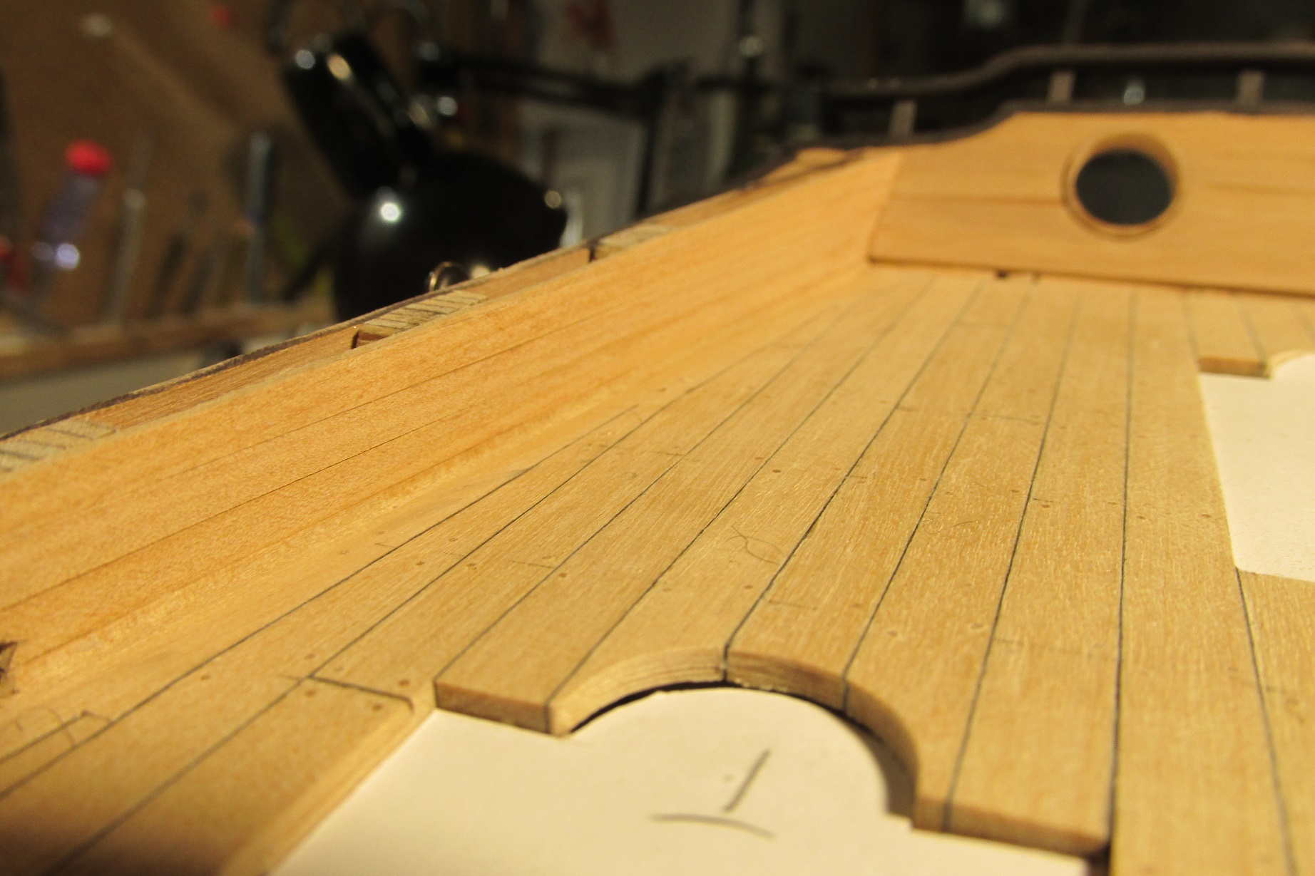 To co widać na kolejnej fotce to pokład zaraz po szlifowaniu. Krążek wycięty z papieru 150. Przed malowaniem jeszcze wycyklinuję skalpelem, ale teraz jest zupełnie gładko.