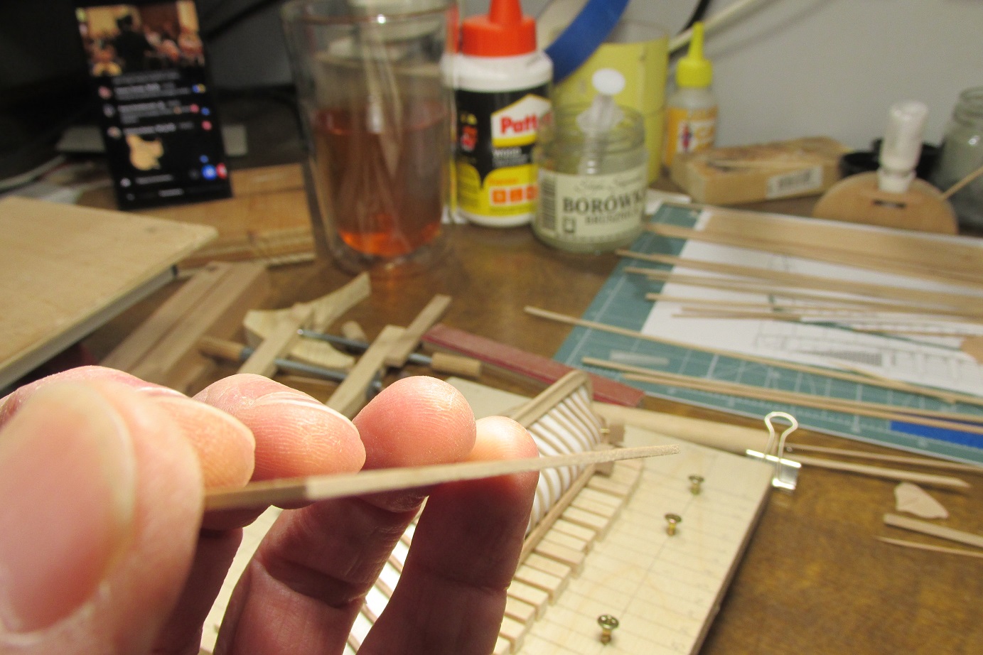 Dalsze prace nad poszyciem szalupy. W czasie kiedy klej potrzebował czasu na wyschnięcie, przygotowałem greting na rufową część szalupy. Ponieważ greting jest cienki 1,4 mm to deseczkę na okoliczność frezowania podkleiłem na krańcach na drewnianej podstawce.