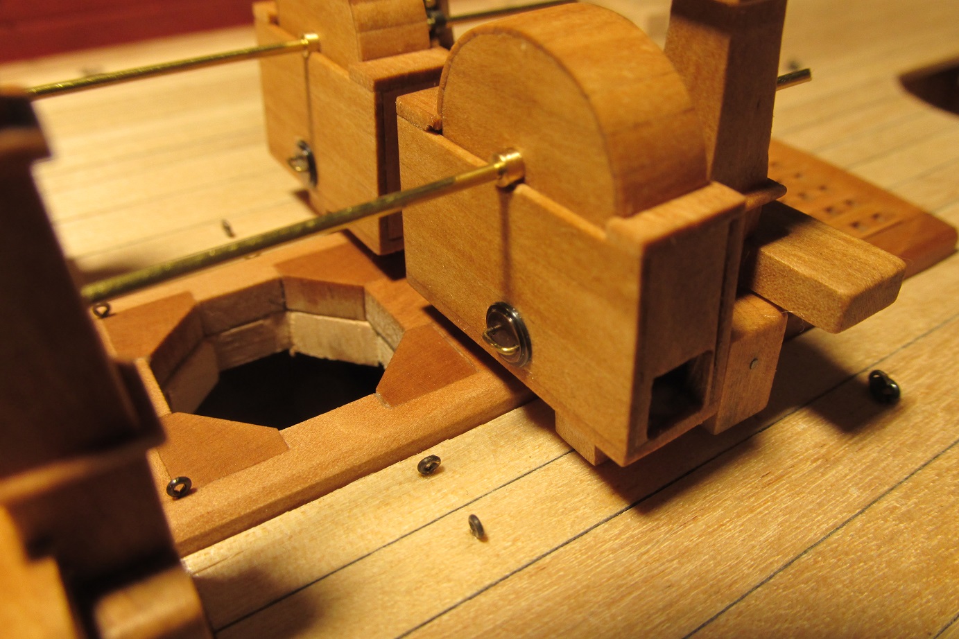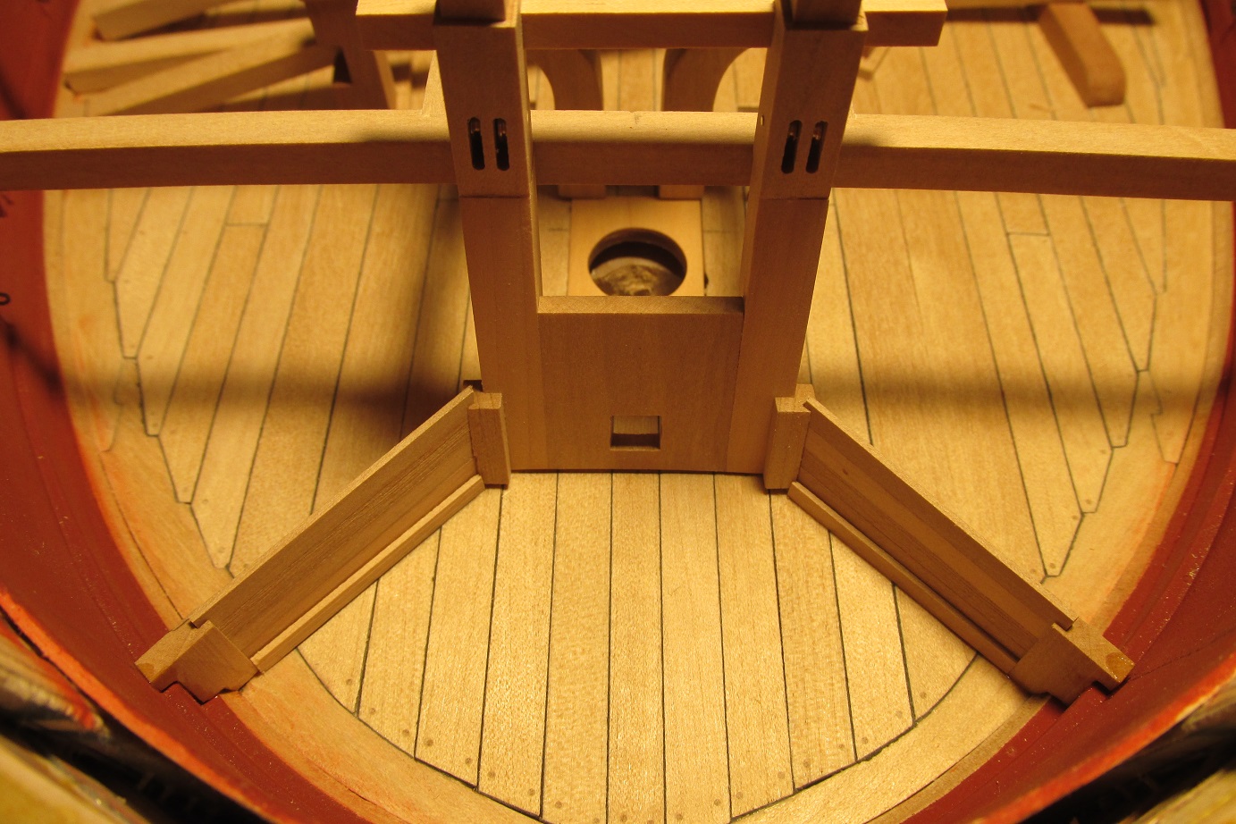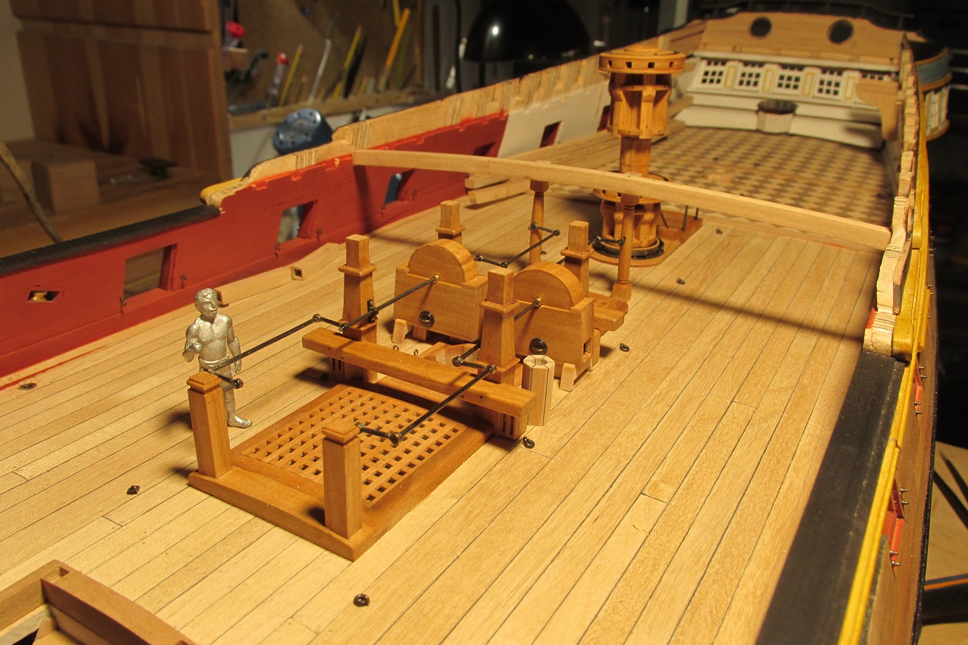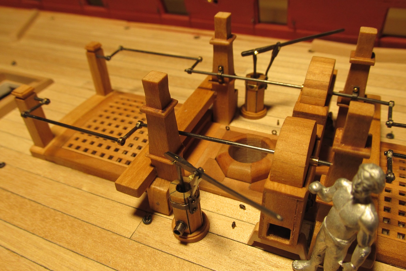Myślałem o pompach. Na fregacie Sphinx (1775), HMS Pandora (1779), HMS Naiad (1797) są, jak widzę pompy (korbowe) jak na poniższym zdjęciu. Natomiast w planach HMS Enterprize takiej nie ma, czy to możliwe żeby ta właśnie fregata różniła się tak bardzo od pozostałych tej samej klasy i z tego samego okresu?