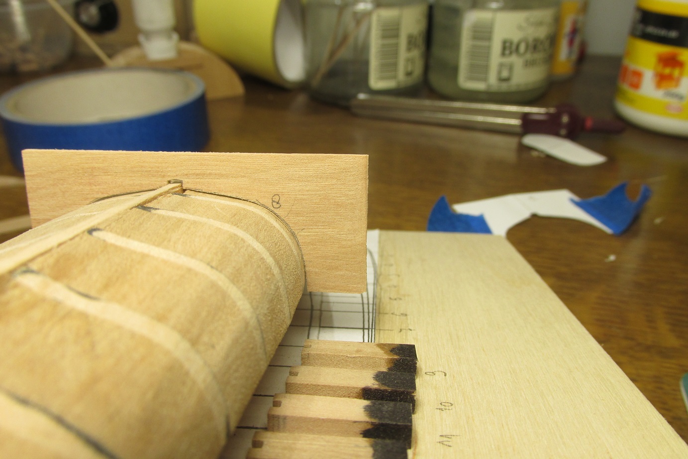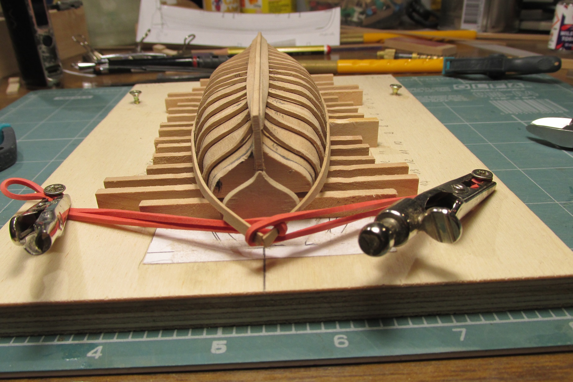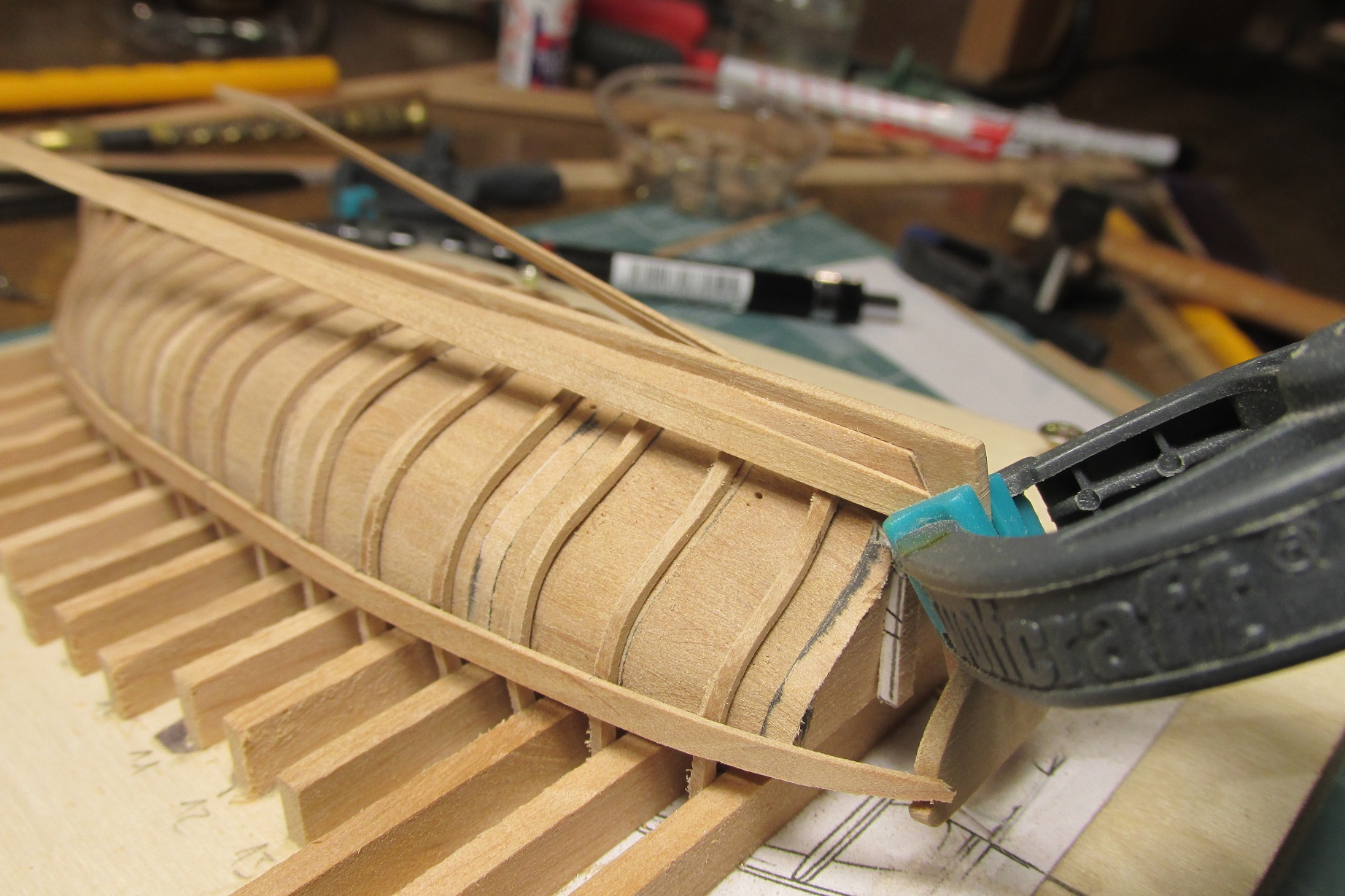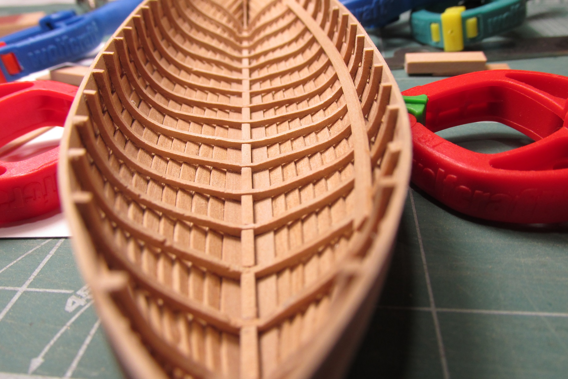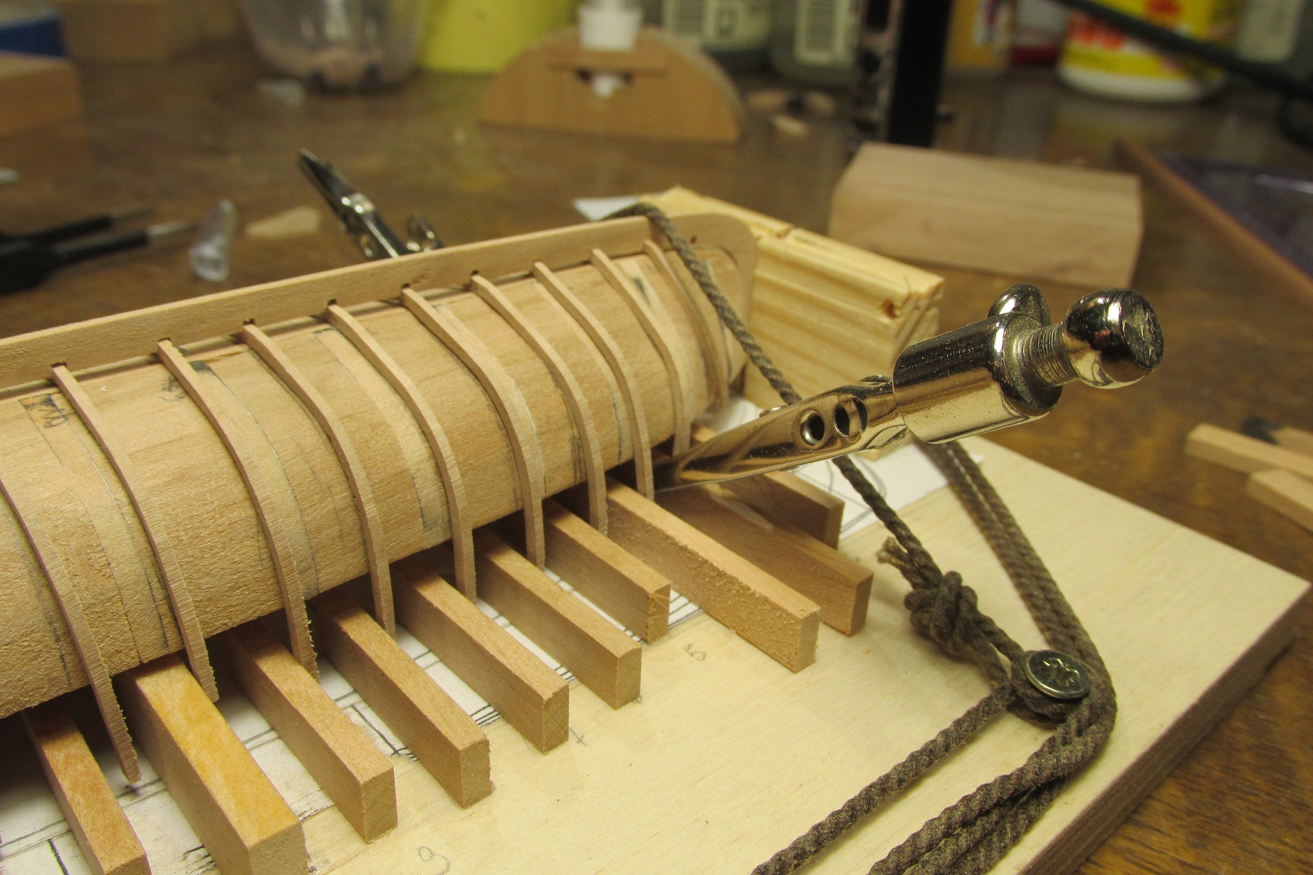Pracuję teraz nad drugą szalupą. Pierwsza już gotowa. Tę drugą robię innym sposobem, wręgi wycinam nie wyginam i poszycie będzie klinkierowe. Jak kilkukrotnie podpowiadał Tomek, do tego rodzaju poszycia najlepiej przygotować plankę z frezem, tak też zamierzam robić.