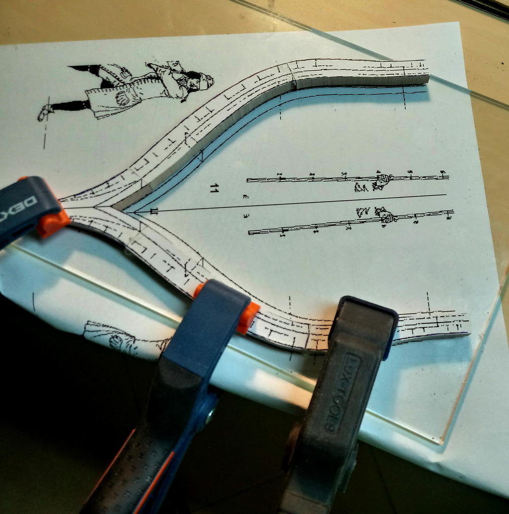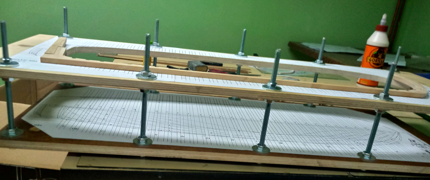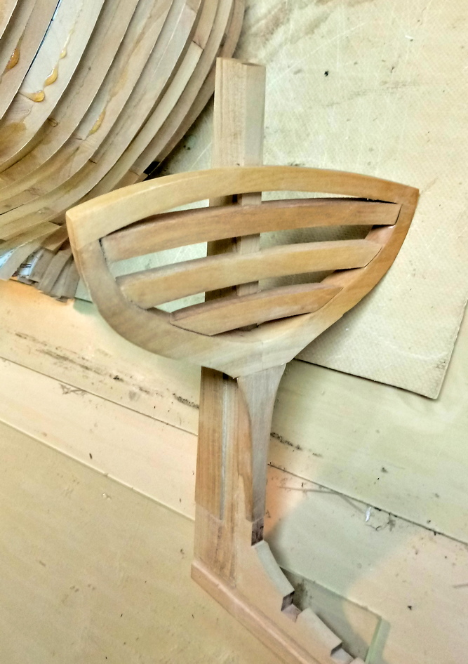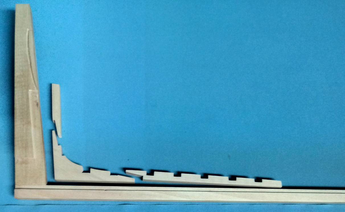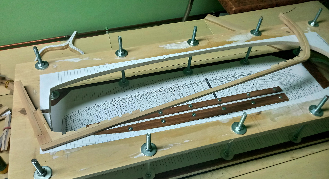 Zacząłem od wykonania stępki.Drewno, to oczywiście grusza.Stępka sklejona. Jednocześnie trwają prace nad stocznią:W ramach treningu skleiłem główną wręgę. Ta jednak wyląduje w koszu, bo źle wydrukowałem szablony i wyszła nieco za mała.