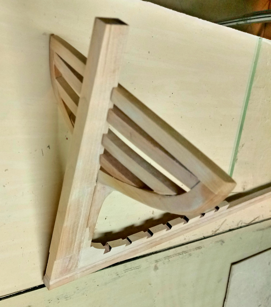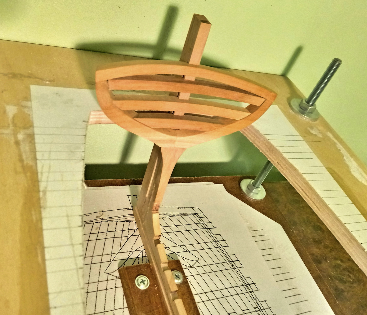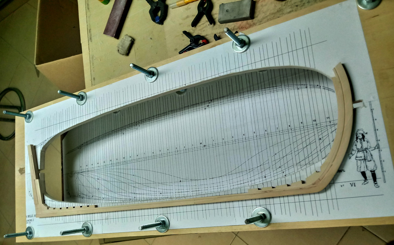 Zacząłem od wykonania stępki.Drewno, to oczywiście grusza.Stępka sklejona. Jednocześnie trwają prace nad stocznią:W ramach treningu skleiłem główną wręgę. Ta jednak wyląduje w koszu, bo źle wydrukowałem szablony i wyszła nieco za mała.