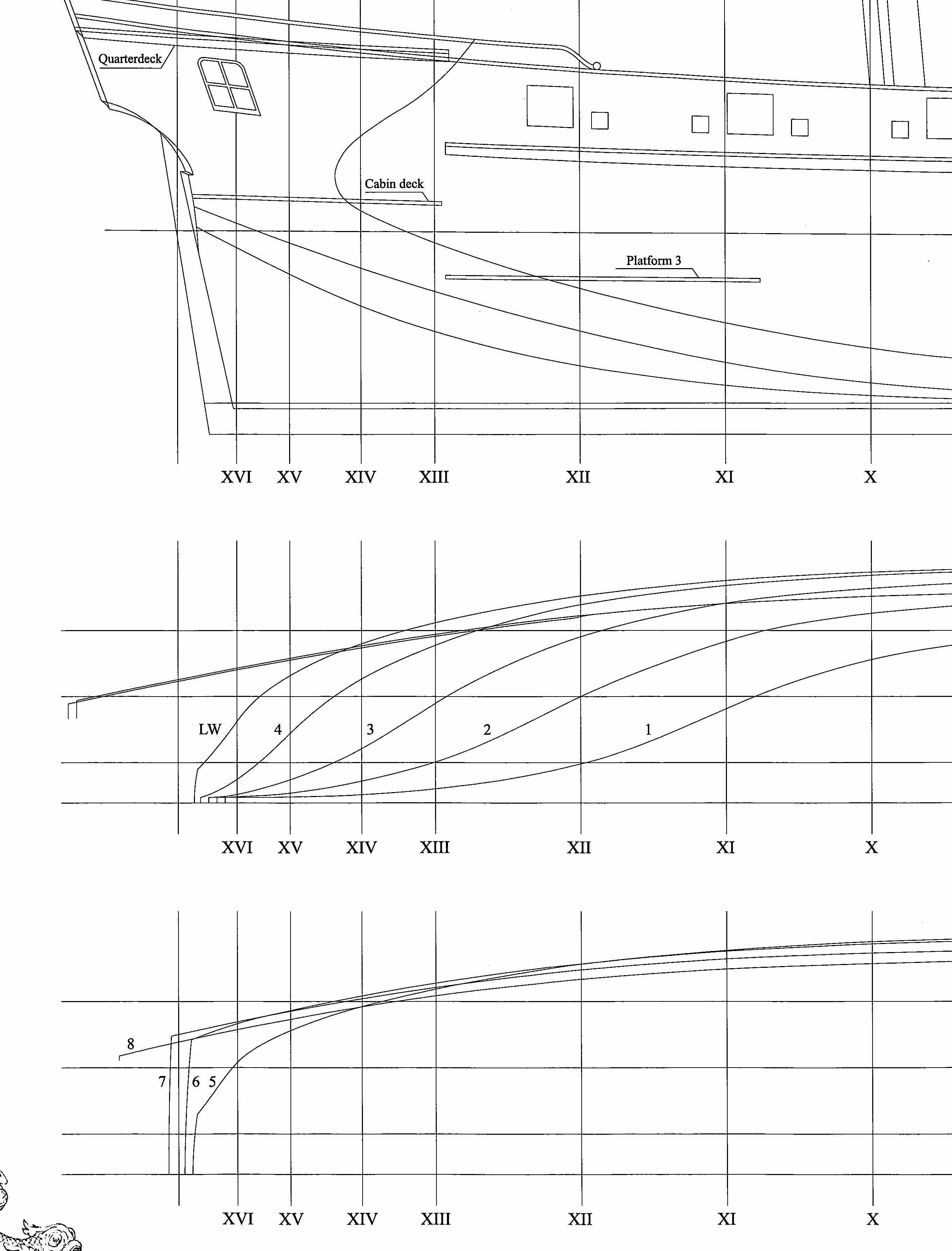 Ja tam znawcą nie jestem, ale ten rysunek jest mocno podejrzany. Wynika z niego, że poszycie denne rufy nie jest wywinięte do górnej pawęży. Tylko w okrętach brytyjskich tamtego okresu były. masz może w tych planach linie wodnic?