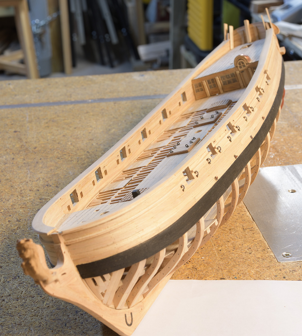 Nie mogłem się doczekać, aby zobaczyć docelowy kolor użytego drewna (olcha, głóg, kawałek egzotyka) i kilka elementów pomalowałem olejem. Trwa montaż burt. Tutaj trochę czasu minie, jest bowiem sporo drobnych akcesoriów, a i samo poszycie jest czasochłonne (1 planka dziennie)