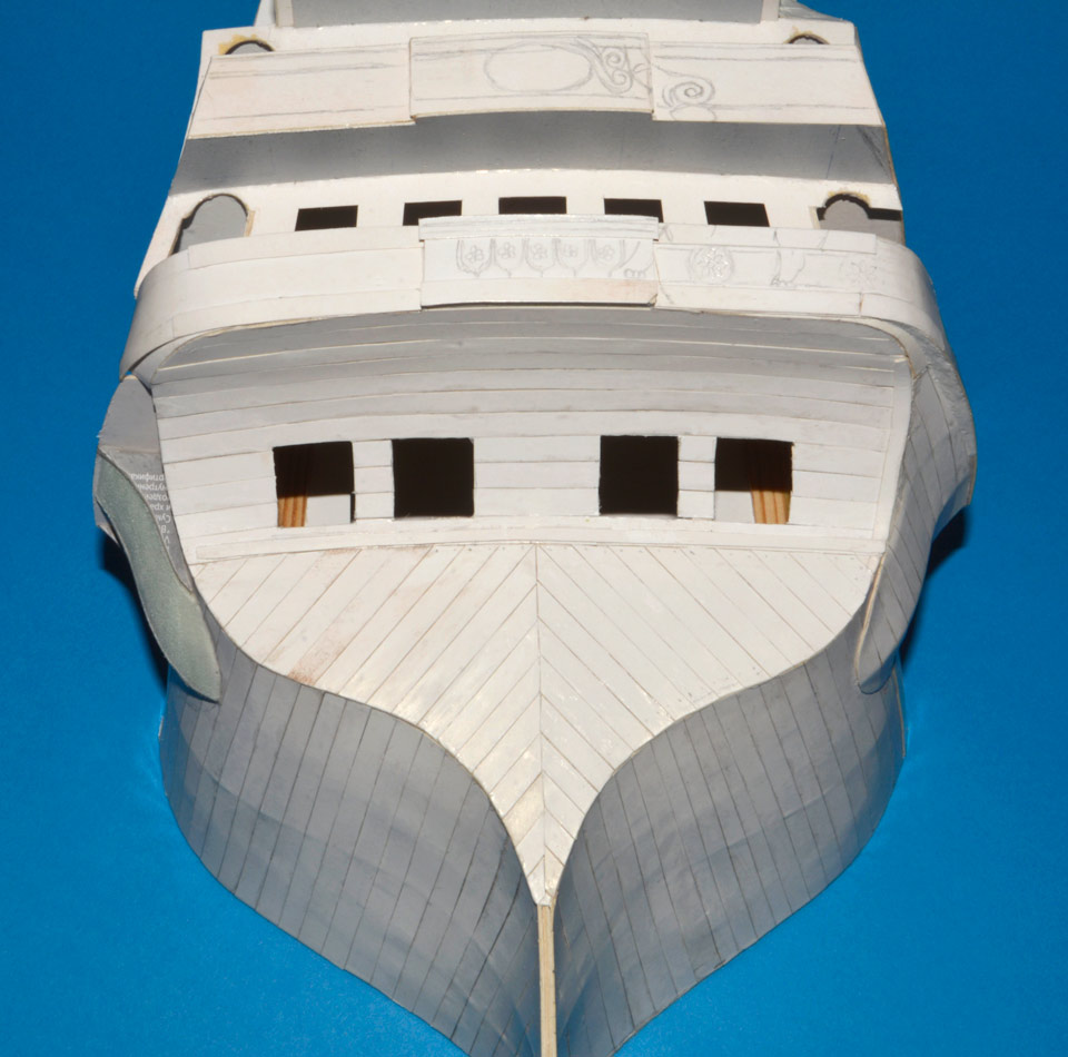 Dokleiłem brakującą barierkę trzeciego balkonu i poszyłem bakburtę (czyli od rufy lewą stronę modelu).
