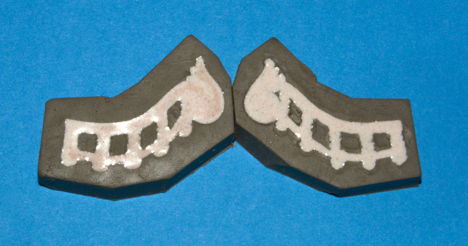 Elementy powstają również "metodą negatywową" przypomnę detal rzeźbię ("wyciskam") w plastelinie, odlewam prototyp, który "dopieszczam" do wersji końcowej, tenże odciskam w plastelinie i odlewam elementy końcowe.
