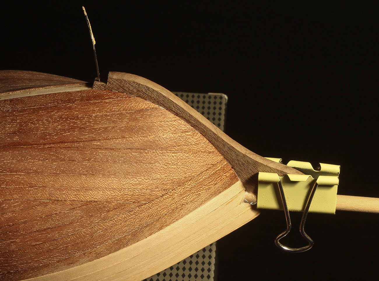 Przyszła stępka, stewa dziobowa i rufowa. Zgodnie z wcześniejszymi planami zastąpiłem gotowe elementy ze sklejki 5mm na orzech afrykański 4mm.