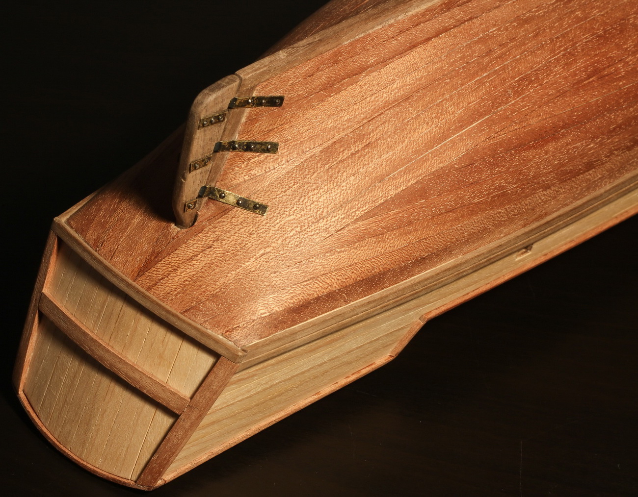 Wykończyłem górę burt sklejką własnej roboty, zrobioną z trzech warstw forniru mahoniowego 0,6 mm, klejonego wzdłuż słojów. W zestawie były na to wycięte elementy ze sklejki do pomalowania czarnym flamastrem / pobejcowania. To jest ta listewka poniżej. Dla porównania te listewki powyżej to zwykły lity mahoń: