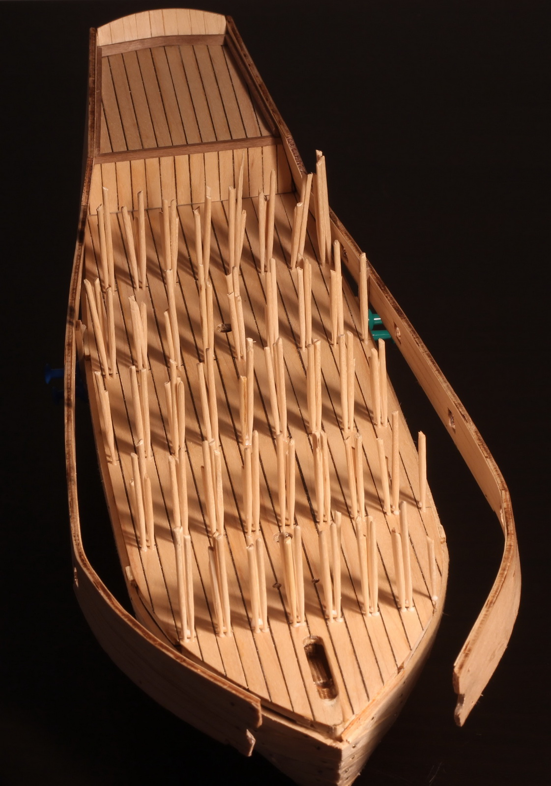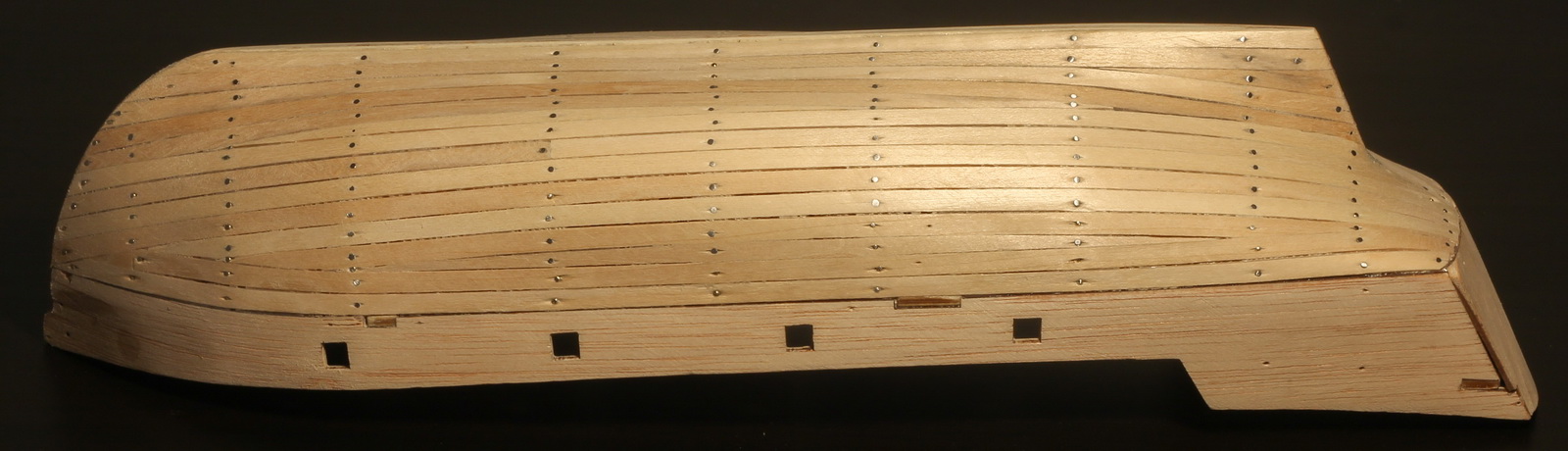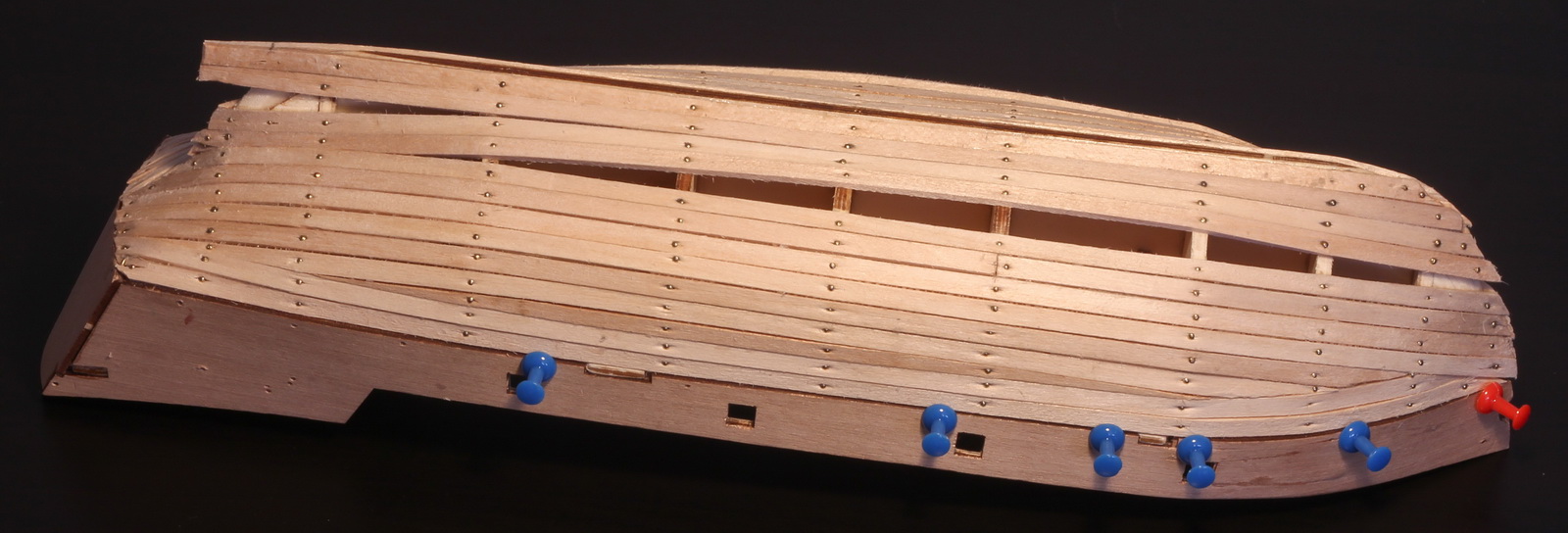 Dokończyłem pierwszą warstwę poszycia, i wkleiłem kołki w pokład. Jutro wielkie szlifowanie.