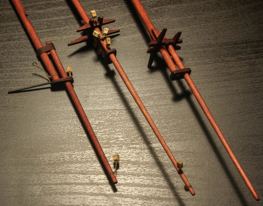 Owinąłem jufersy drutem miedzianym 0,5 mm, zlutowałem, wyszlifowałem i zaoksydowałem. Żeby zachować kąt want, odciągi poczekają z docięciem i przyklejeniem na maszty. Spróbuję też zrobić imitację gwoździków: