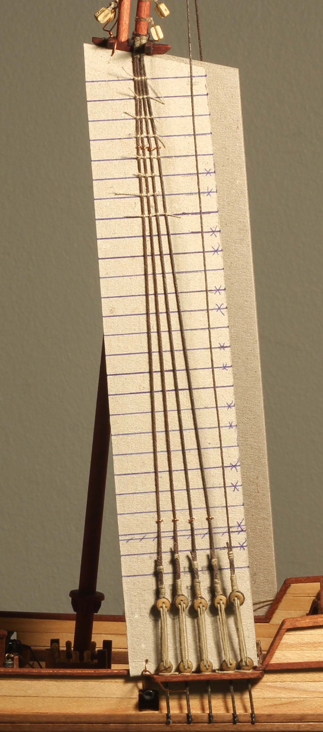 Nie zrobiłeś błędu według Peterssona z książki Rigging period ship models, jest dobrze, taki szczegół tylko, że pierwsza wanta powinna być owinięta, jakoś to ma swoją nazwę, ale nie pamiętam. Wanta była wzmacniana, bo była najbardziej narażona na warunki atmosferyczne i ocieranie się żagla. Twój takielunek prawdopodobnie będzie uproszczony i w instrukcji tego nie piszą dla tego będziesz usprawiedliwiony pomijając takie szczegóły, bardzo dobrze Ci idzie, trzymam kciuki i pozdrawiam.