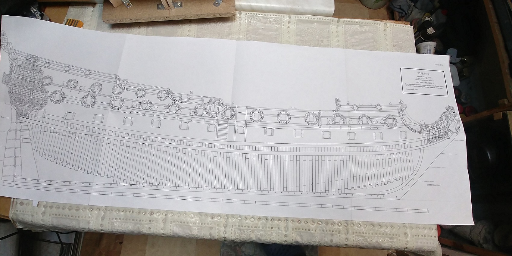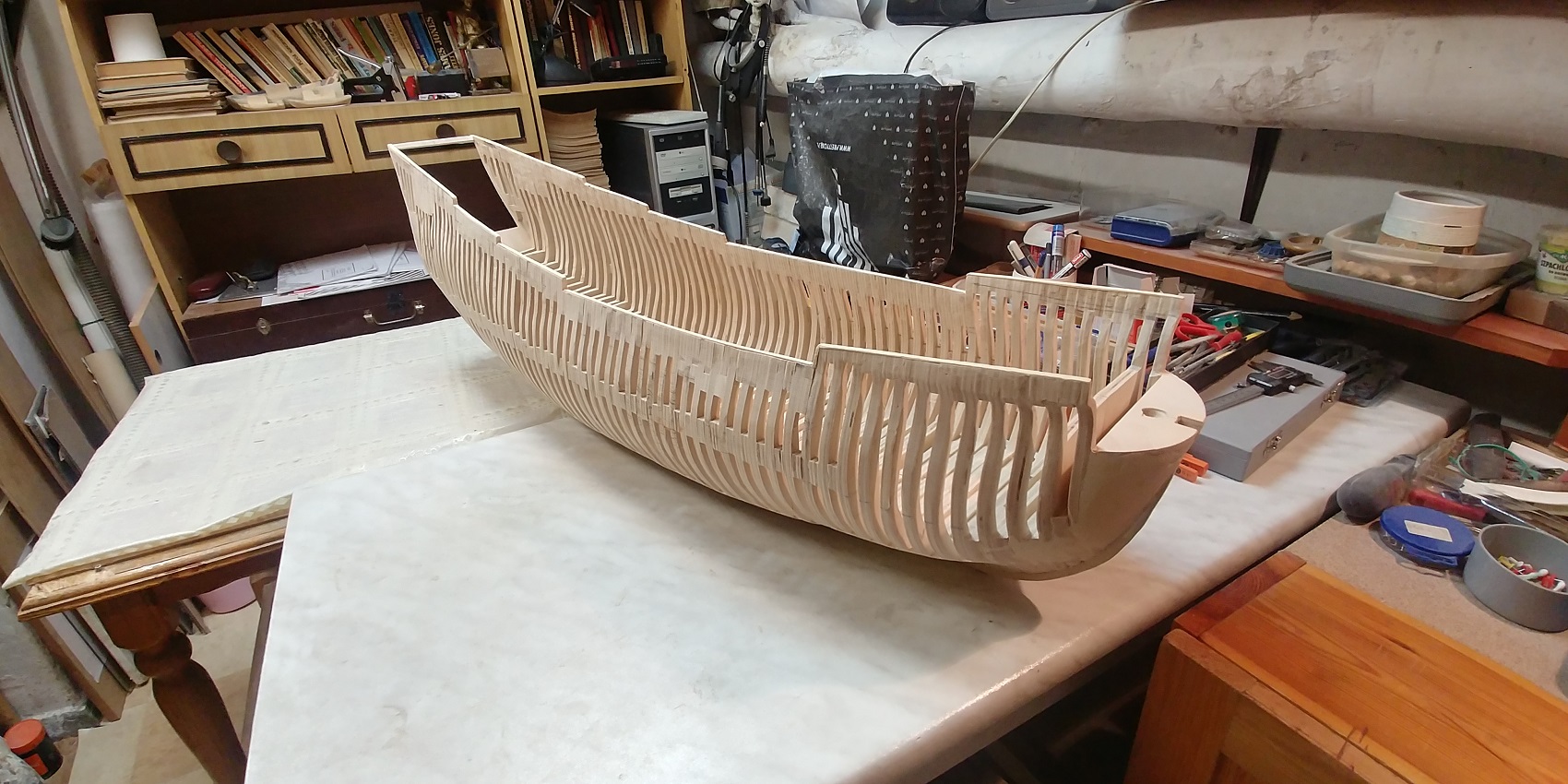 Kadłub będzie cały kryty tak,że sklejka nie przeszkadza a nawet ułatwia.Postawiłem sobie zadanie zbudowanie szkieletu.Co będzie dalej nie wiem bo to robota na lata.Model jest duży,może nawet zbyt duży jak na moje warunki lokalowe.Całe szczęście,że cięcie i pylenie jest w innym pomieszczeniu a tu tylko montaż.Życzcie mi wytrwałości.
