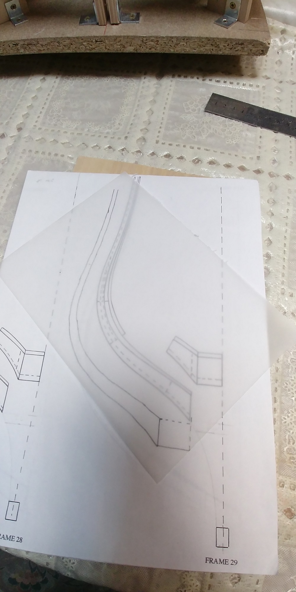 Nowy projekt i nowe wyzwanie.Szkielet sklejkowy gr.8 mm.co pasuje w/g projektu bo grubość wręg też taka sama.