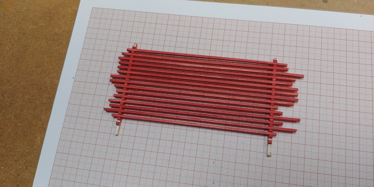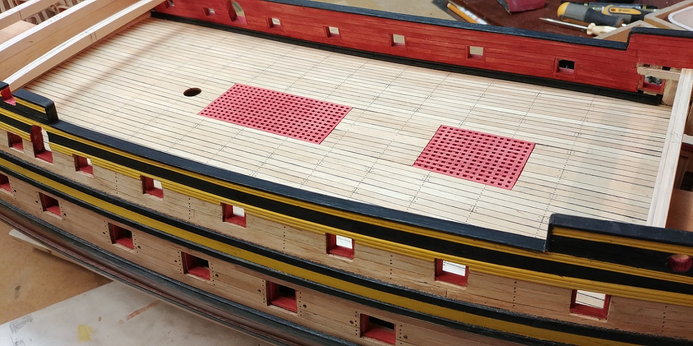 Główny pokład z gretingami już przyklejony.Przy okazji dorobiłem ster i kluzy.