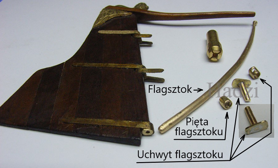 Tym razem przedstawiam na zdjęciu wykonane z mosiądzu elementy składowe flagsztoku. Flagsztok zostanie złożony i zamontowany później. Została jeszcze do wykonania flaga holenderska. Jest to dla mnie wyzwanie, z którym po raz pierwszy muszę się zmierzyć. Nigdy nie malowałem płótna i nawet nie wiem, jakich farb użyć. Będę musiał poczytać na ten temat. Po wykonaniu flagi i jej uformowaniu będę montował ster i flagsztok na jachcie.