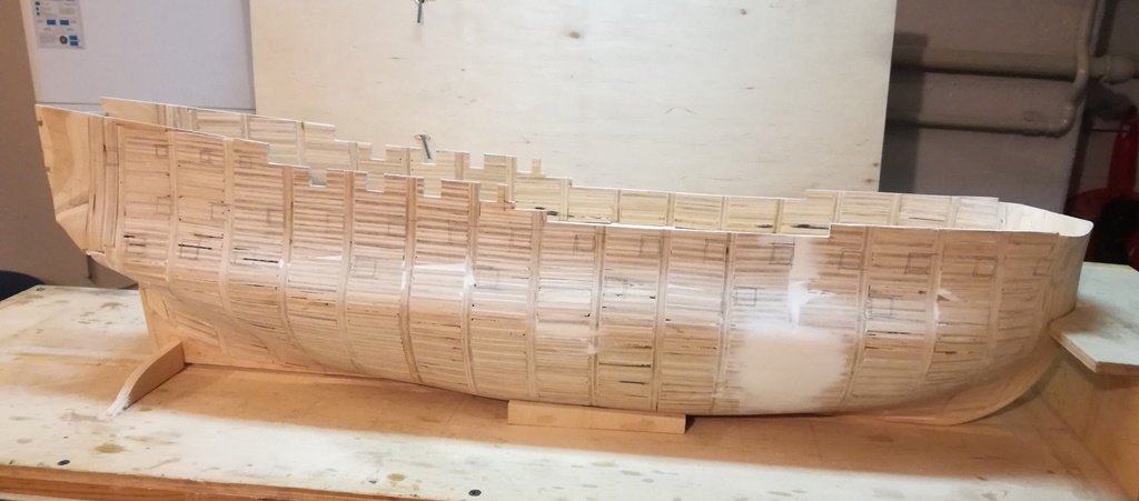 Witam po dłuższej przerwie, trzeba było trochę odczekać po poprzednim modelu by nabrać chęci do następnego projektu. Model będzie budowany w standardowy sposób czyli pełne poszycie ,olinowanie i ożaglowanie coś w stylu stateczek na telewizor :D, dlatego kadłub zbudowałem ze sklejki , na grodziach i z wypełnieniem . Skala 1:64 co by nie był za duży a i tak będzie ponad metr w całości. Buduje w oparciu o plany Ancre , które przeskalowałem do potrzebnego rozmiaru. Jak widać kadłub prawie gotowy wyszlifowany i wyszpachlowany po wycięciu otworów działowych można zacząć poszycie .
