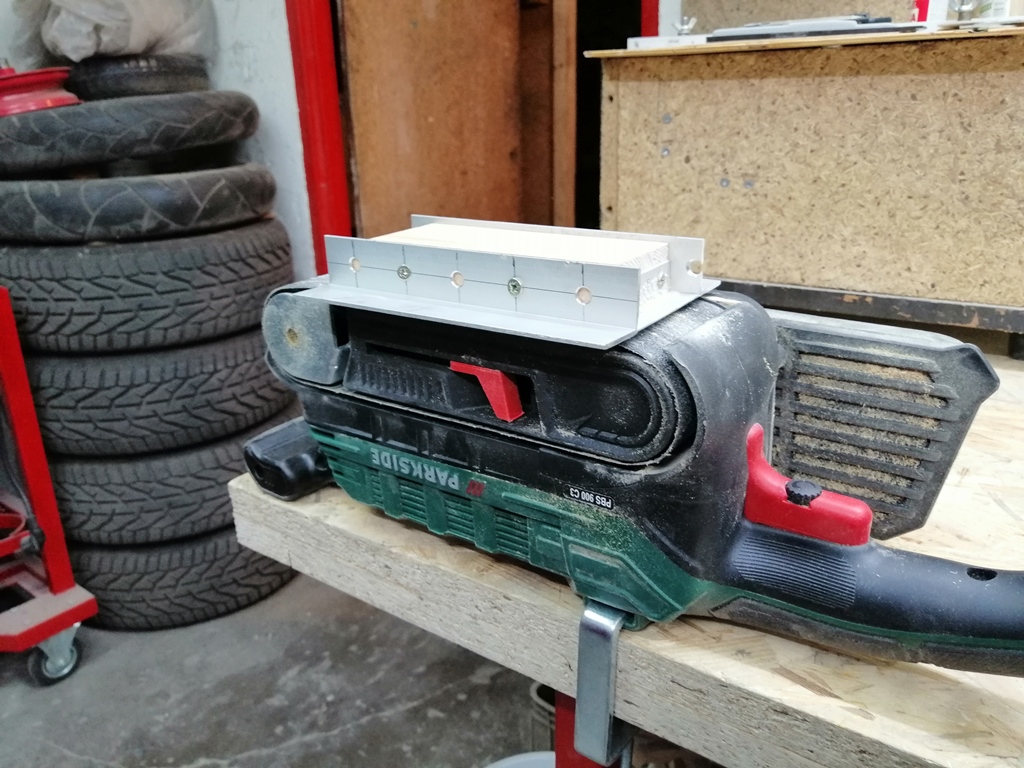 W pudełeczku umieszczałem przycięte deseczki (na całej dostępnej szerokości pudełeczka, tak aby były ciasno upakowane), a następnie szlifowałem na szlifierce taśmowej.